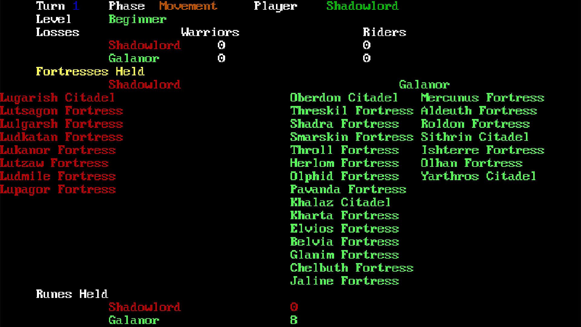 The Shadowlord, the evil sorcerer who rules the Northern Shadowlands, has invaded the ancient lands of Galanor. In this fantasy wargame simulation, you must gather the free forces of Galanor and stem the advancing might of the Shadowland.