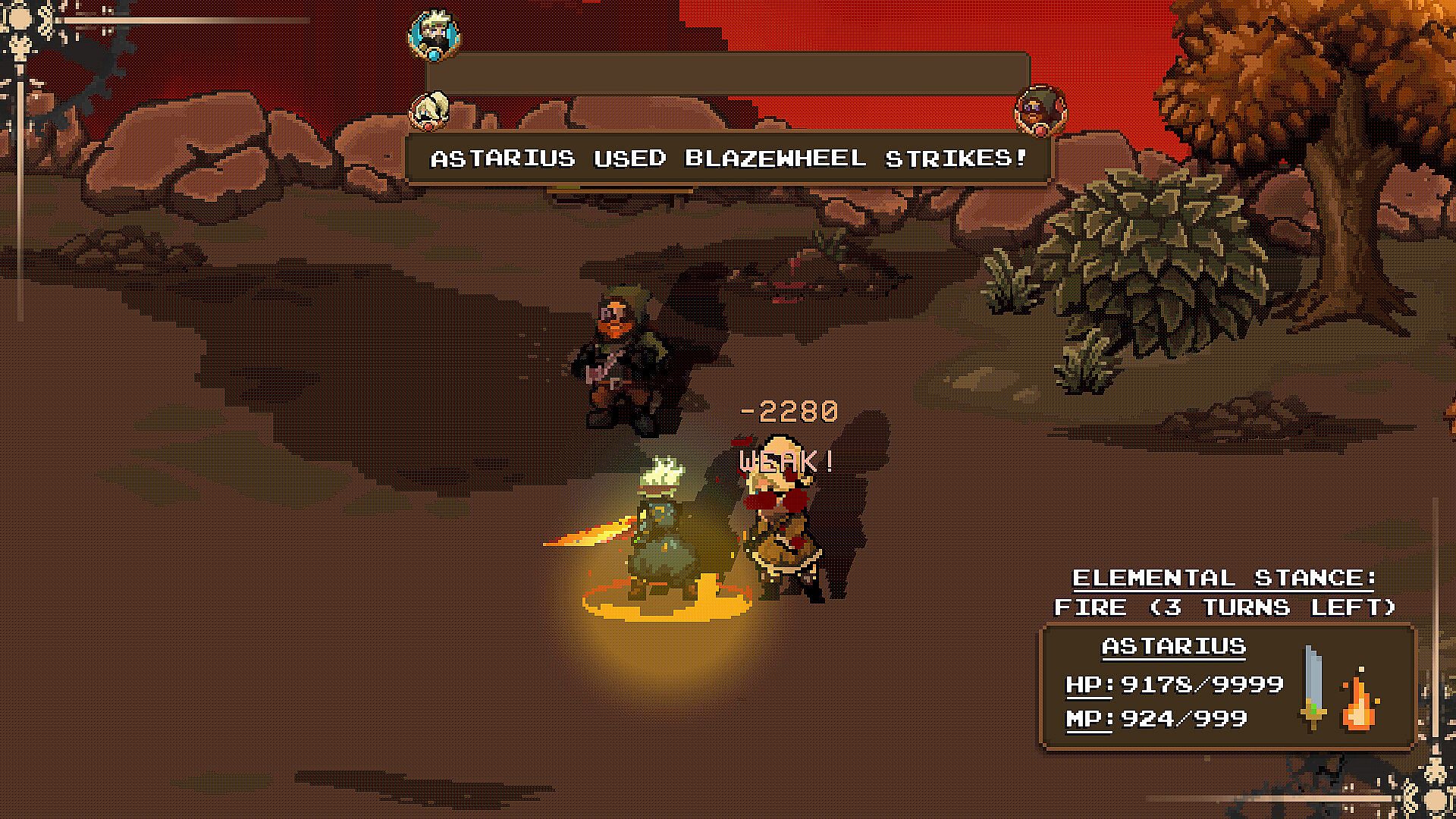 • Elemental strategy: Both Astarius and his enemies have elemental weaknesses and resistances that can be exploited within battle. Astarius's elemental affinity is determined by the stance he is currently using, which changes depending on the skills that you choose.