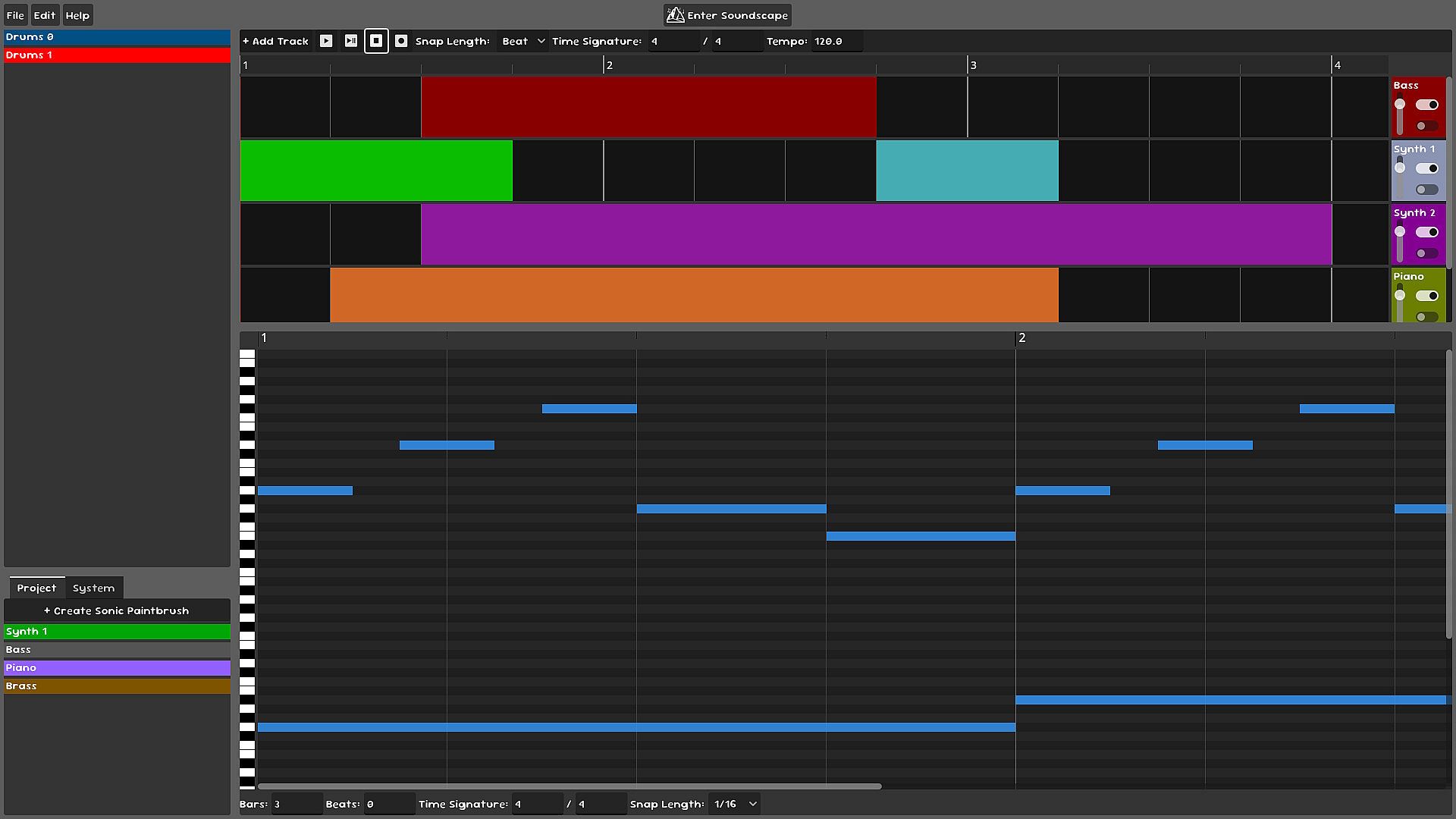 Soundscapes is an interactive music sandbox where sound shapes the world around you. Write music using sonic paintbrushes and watch landscapes emerge from your creations. Every note you play transforms the environment, turning sound into a living, breathing world.