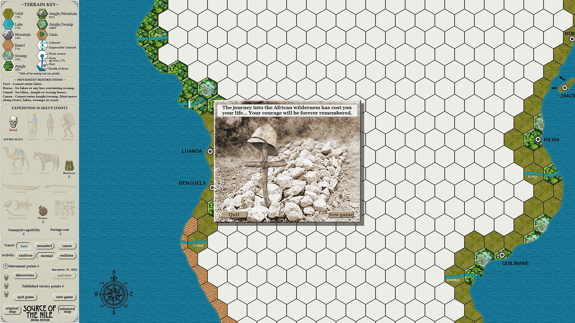 The game is played on a hexagon-grid map showing Africa from Khartoum to Capetown and Lagos to Mombasa. The periphery of this map, showing the territory known ca. 1820, is filled in; the interior is blank and ready to be explored by the player.