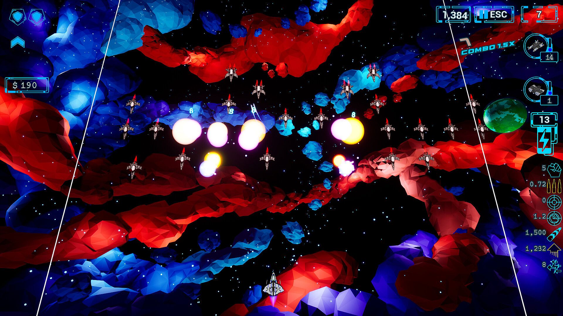 The game retains the straightforward yet engaging mechanics of shooting down enemies hovering on the screen, reminiscent of classic "Shoot em up" titles. The visual design bursts with colors and lighting effects, reminiscent of arcade cabinet games but presented in a modern style