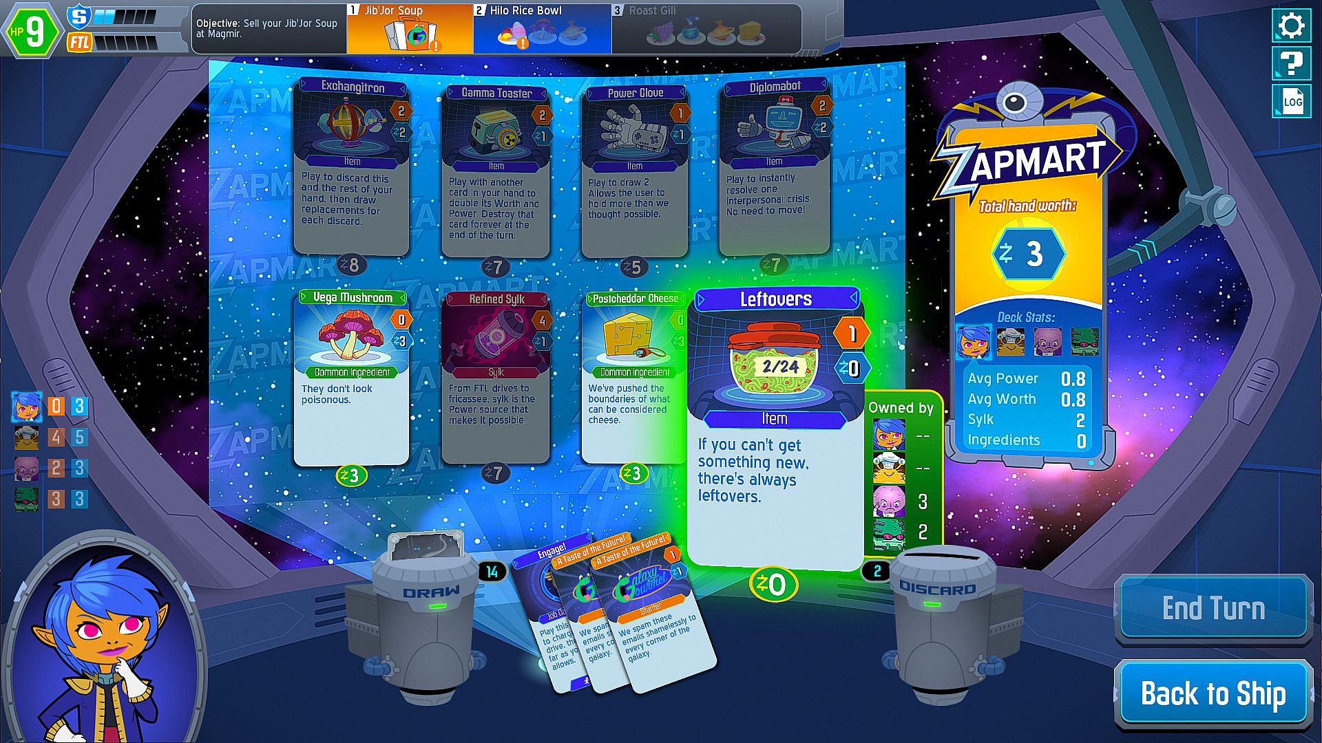 Each character begins the game with a small deck of 10 cards, which you'll play to move around the ship and do your job. You must add a card to your personal deck each turn, and you'll be reshuffling and drawing items and abilities from it all game long. Your goal is to assemble the strongest, most versatile collection possible to do your job, and ultimately bring honor and glory to your food truck.