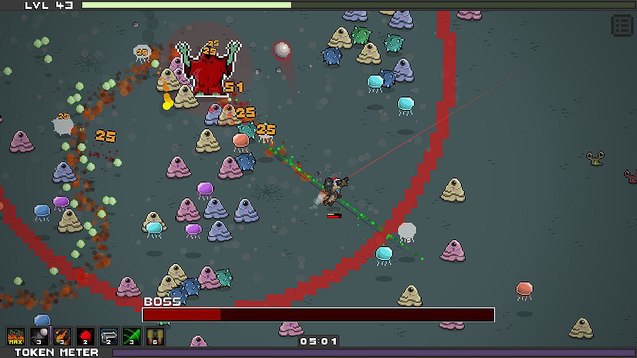 Play as a space marine deployed to alien planets, wiping out hordes in intense top-down 2D bullet-heaven action. Survive 15-minute onslaughts by slaying enemies to gather orbs for experience and level-ups, picking from three random ability cards each time. Limit runs to six damage abilities and one utility ability while filling a Token Meter through kills to spawn Upgrade Tokens, plus extras from bosses. Spend tokens between runs on permanent character boosts, ability enhancements, and mods that shape your style-glass cannon, speed demon, tank, or versatile hybrid. Ability mods occasionally drop in-game, with higher difficulties boosting chances. Casual indie players who enjoy quick, customizable survival runs will find a solid loop here.