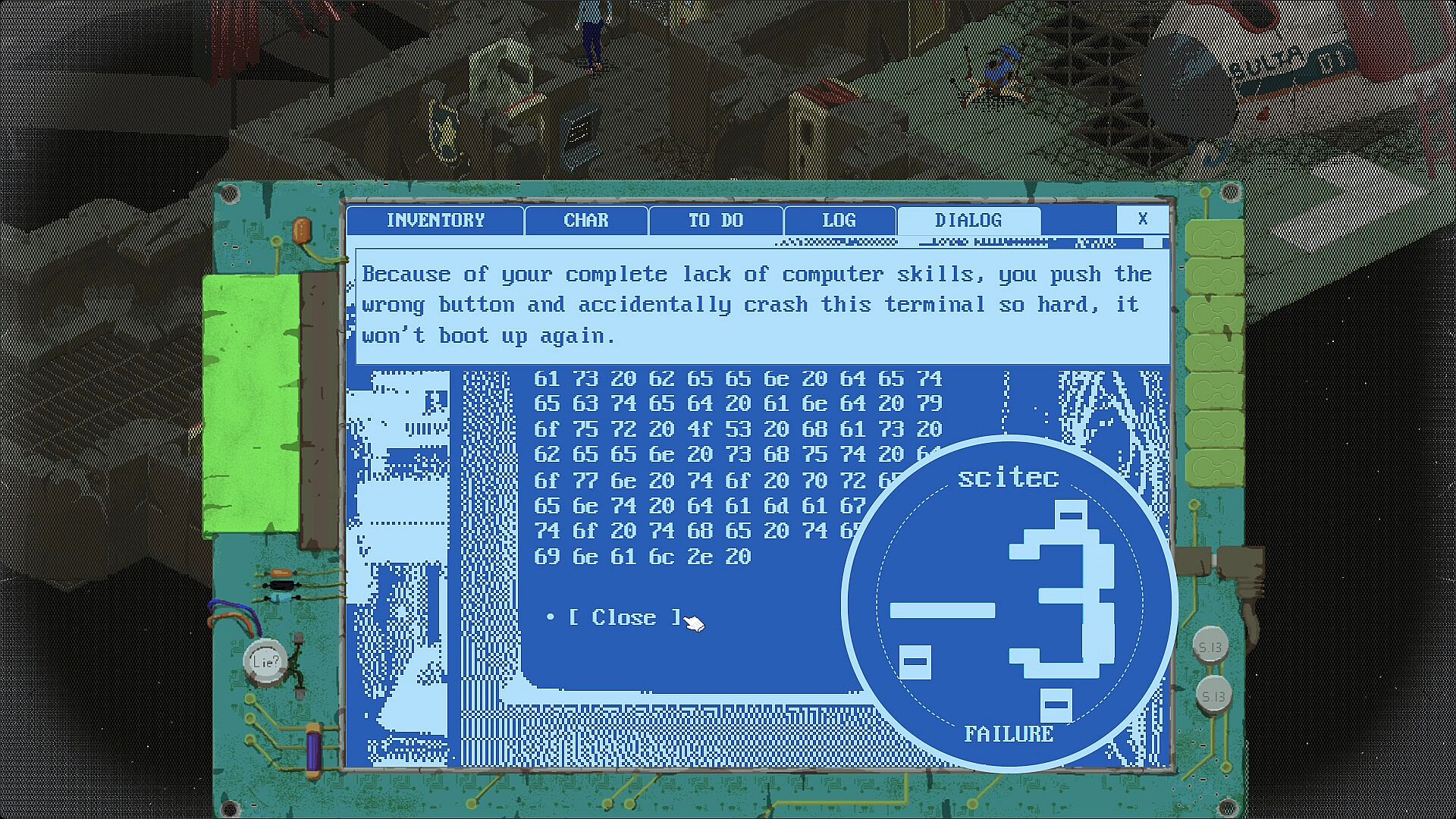 For example, characters with low CHARM value will find that often NPCs won't even talk to them because of how repulsive they are; or speech - if low, that means you are a shy introvert, unable to initiate the dialogue yourself. Lacking computer skills (scitec)? You accidentally crash terminals when trying to use them. Low tinker? Tools might break in your inept hands. Sometimes even too much is not good - too strong (PHYSICAL) and you cannot squeeze into vents thus unable to make use of some shortcuts. And so on - your character stats will significantly affect your gameplay style.