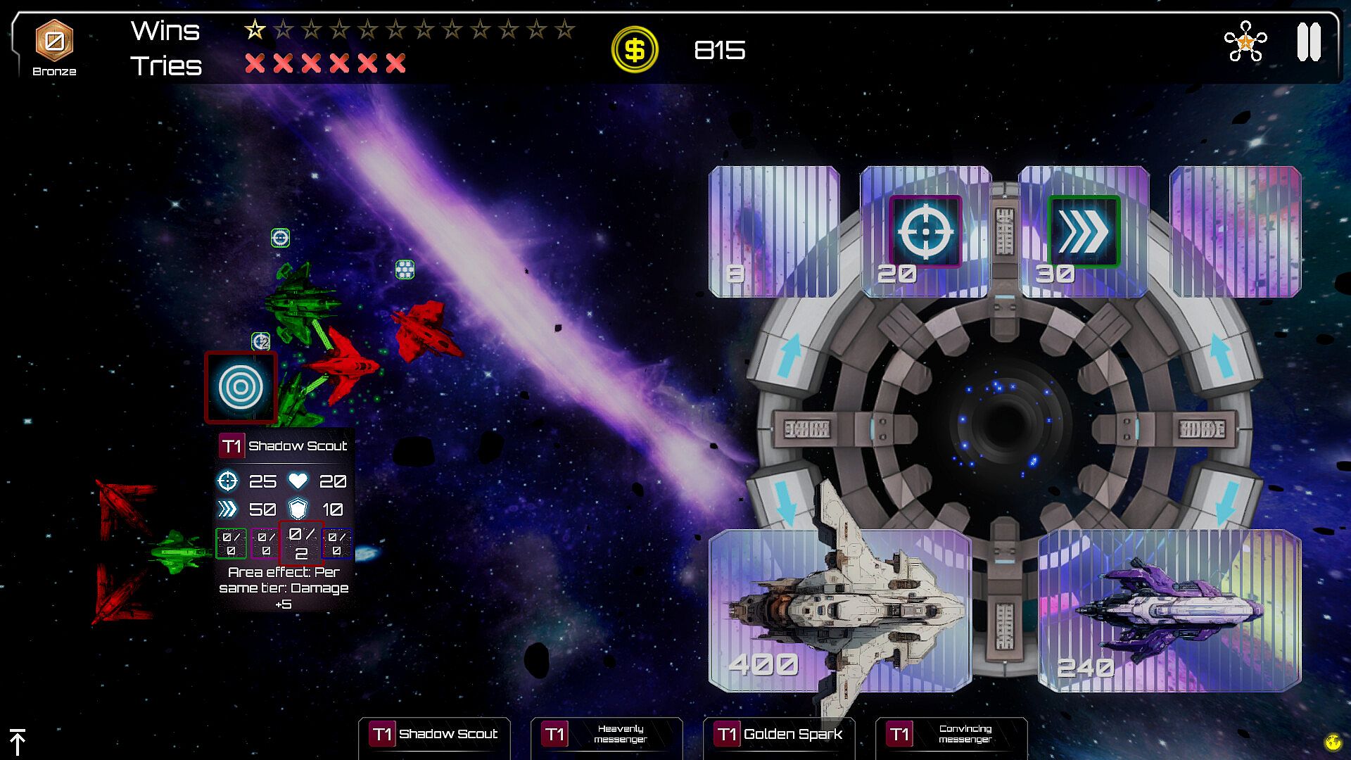 • Combat Tactics: Choose what kind of targets you want your starships to primarily attack and protect your important spaceships by hiding them behind others with stronger defenses.