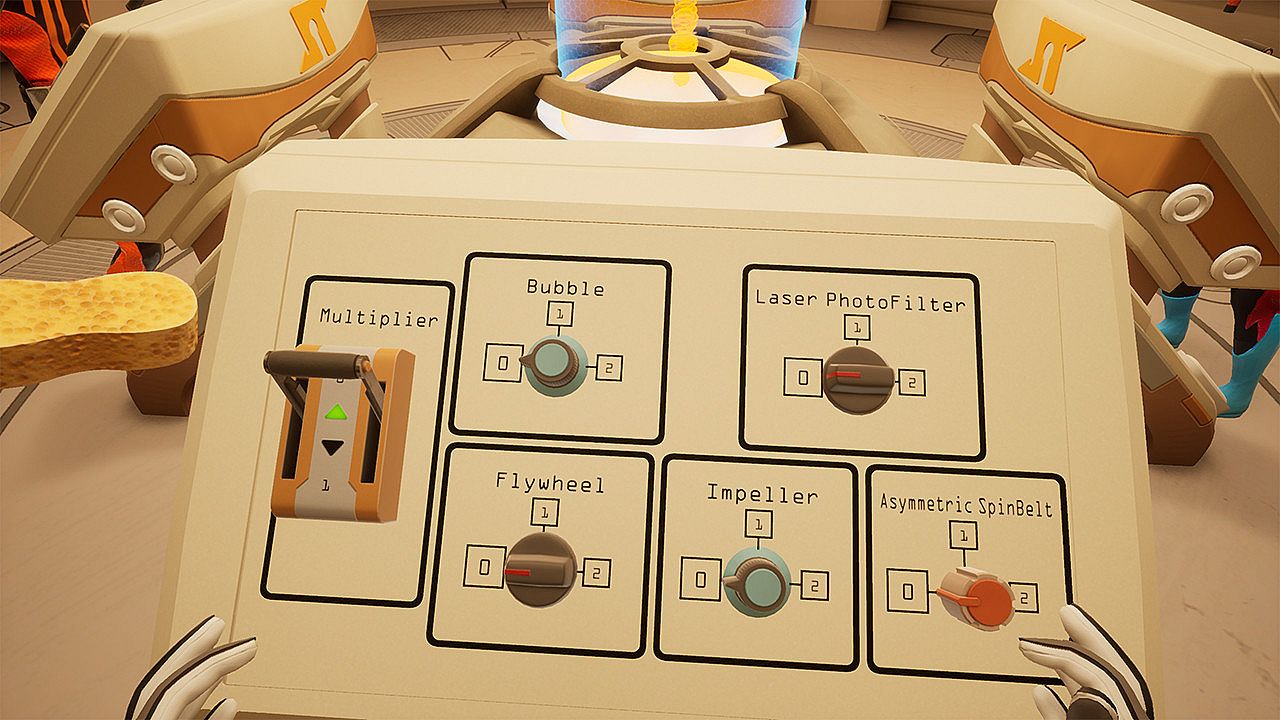 Up to six players play locally with at least one VR headset and connected smart devices, this offers an experience much like the original Spaceteam game. In the VR game each mobile player is represented by a robot.