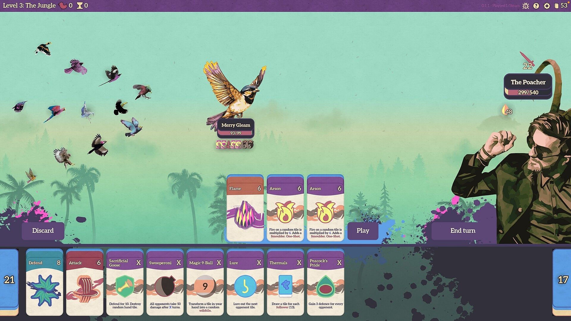 SPARROW WARFARE is a mahjong-inspired deckbuilder where you make wild combinations of tiles to free birds and battle against the fiendish Storyteller and his minions.