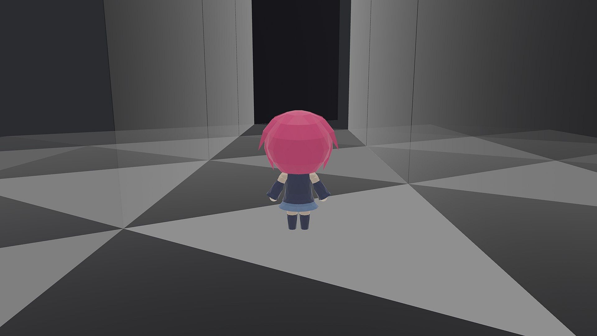 The randomly generated triangular grid maze features mirror reflections that display characters on both floors and walls. Experience a unique visual journey where reality and reflected images blend together.
