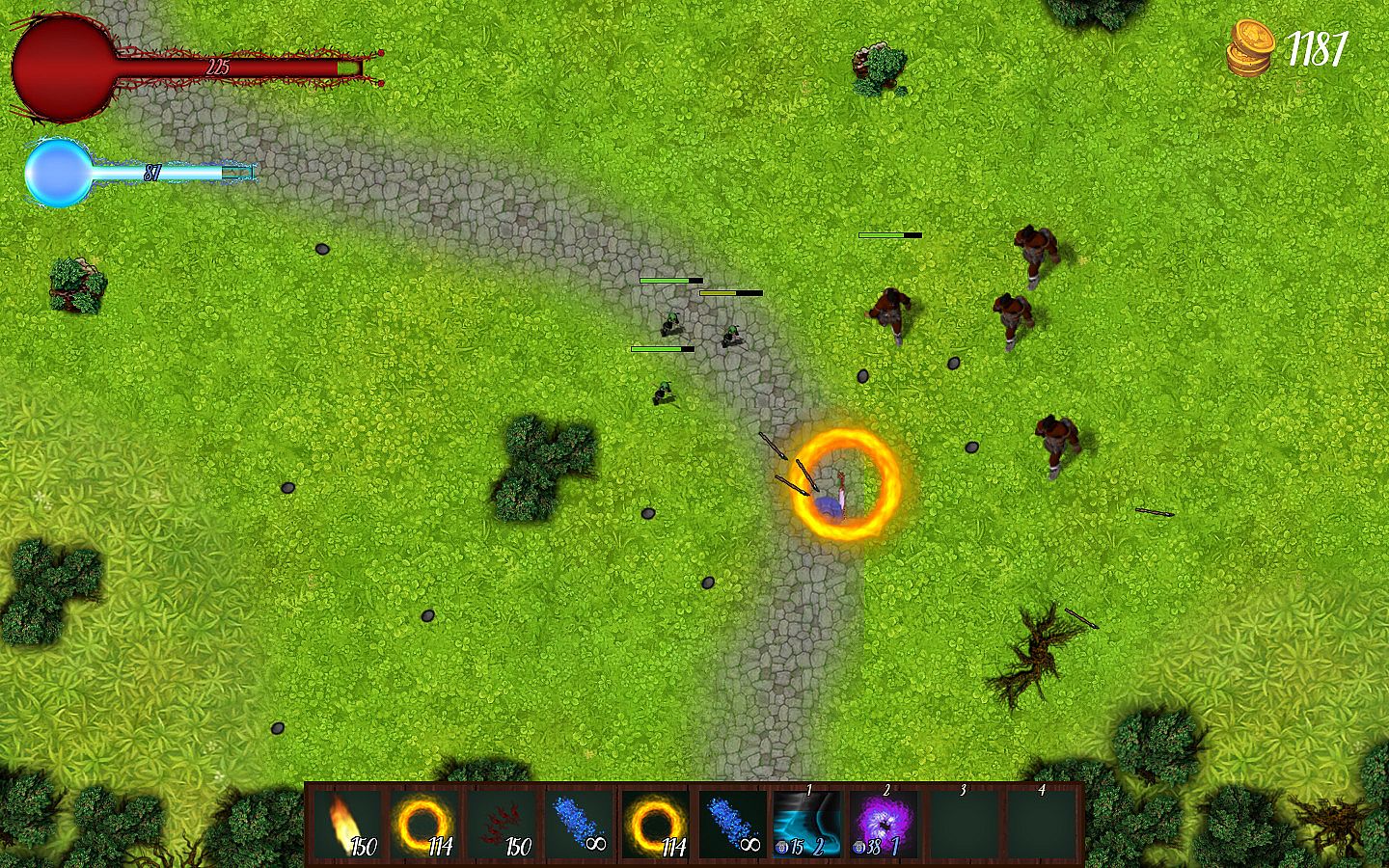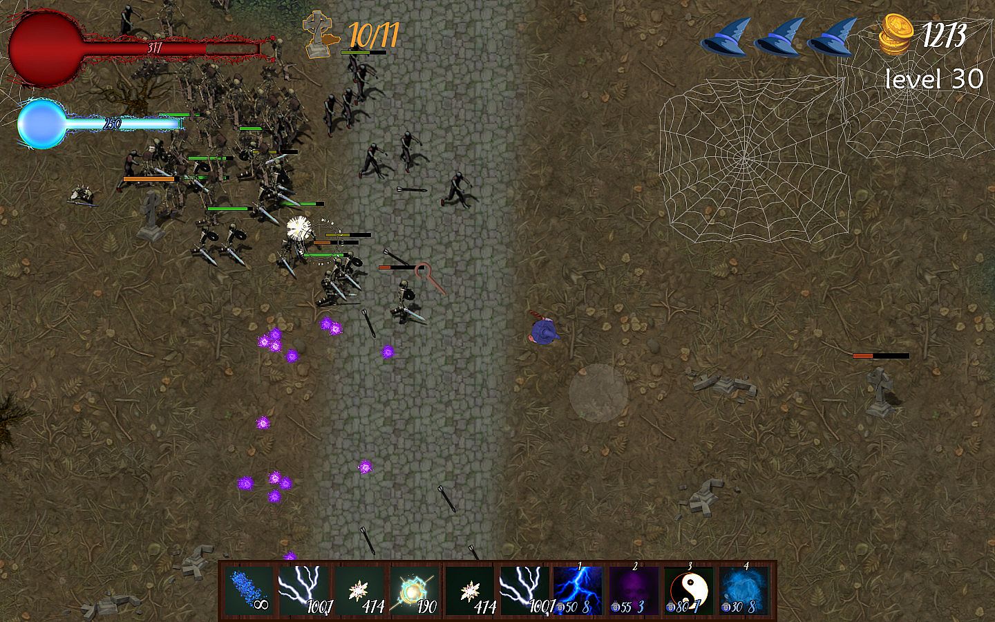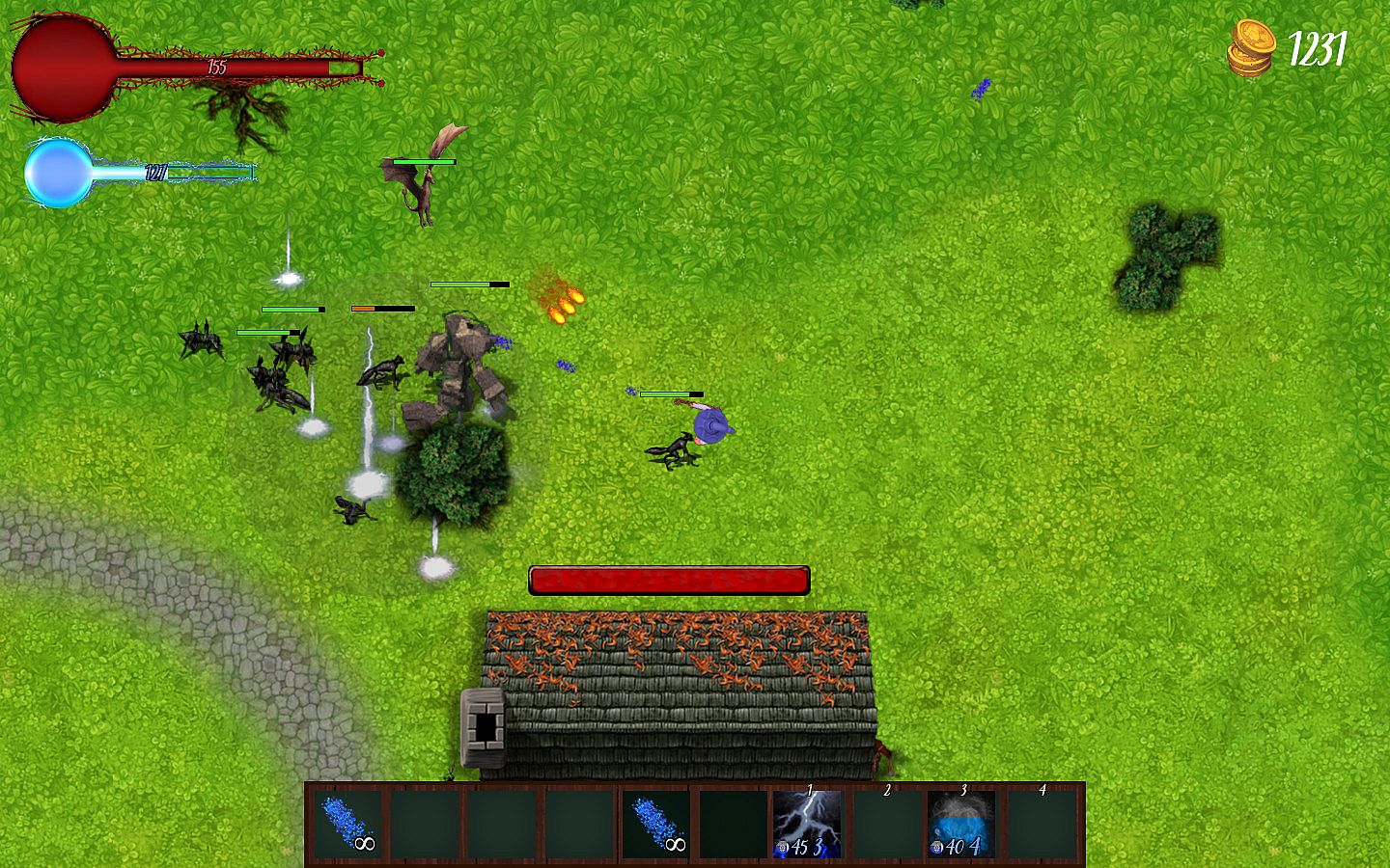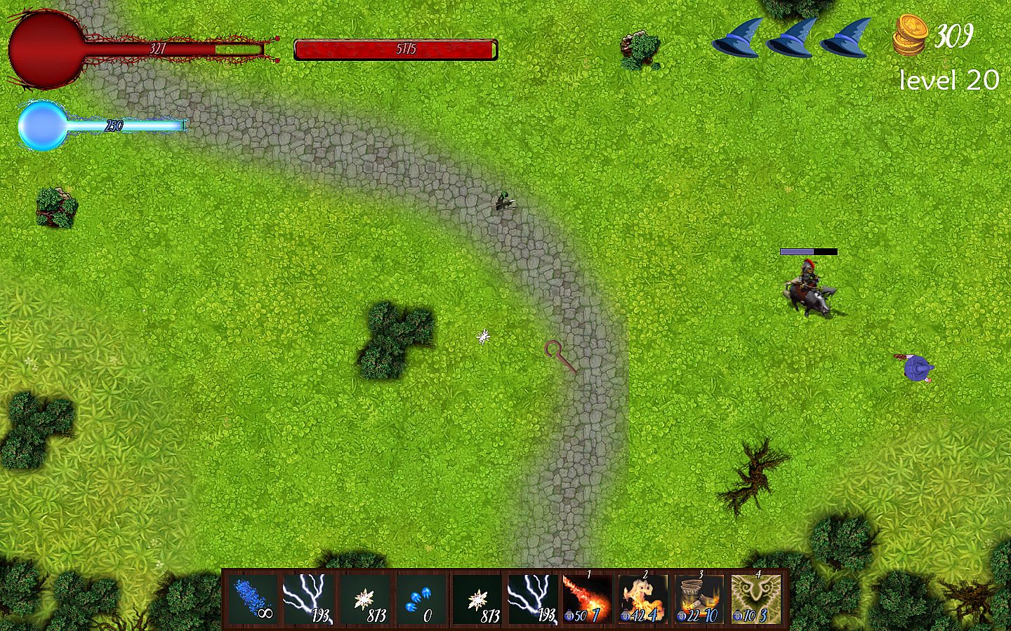 In Spellcaster you control a mage who has to defend his hut from hordes of monsters. Lots of bullets and spells to choose from which you can buy from local store. Choose your build before the next level and face the creatures in this top-down, tower defence, shoot 'em up, action game.