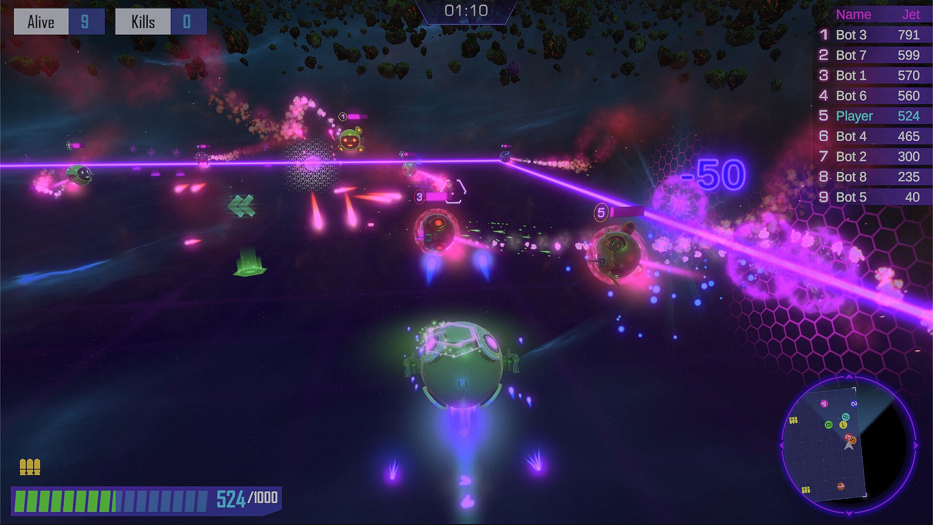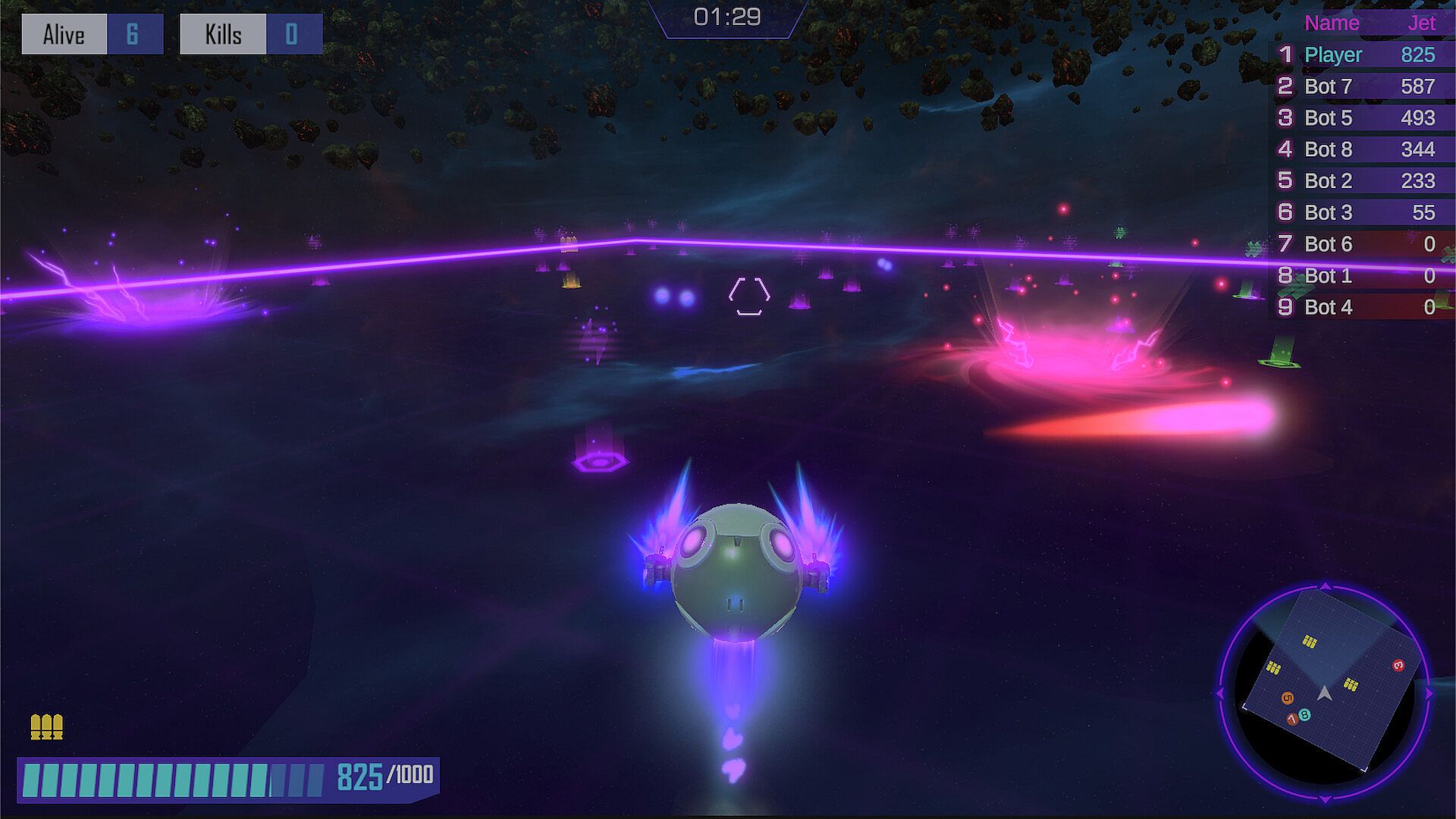 Face off against 8 color-coded AI drones in a single-player free-for-all. Each match is a quick burst of chaos where smart energy management, sharp aim, and well-timed jumps can turn the tide.