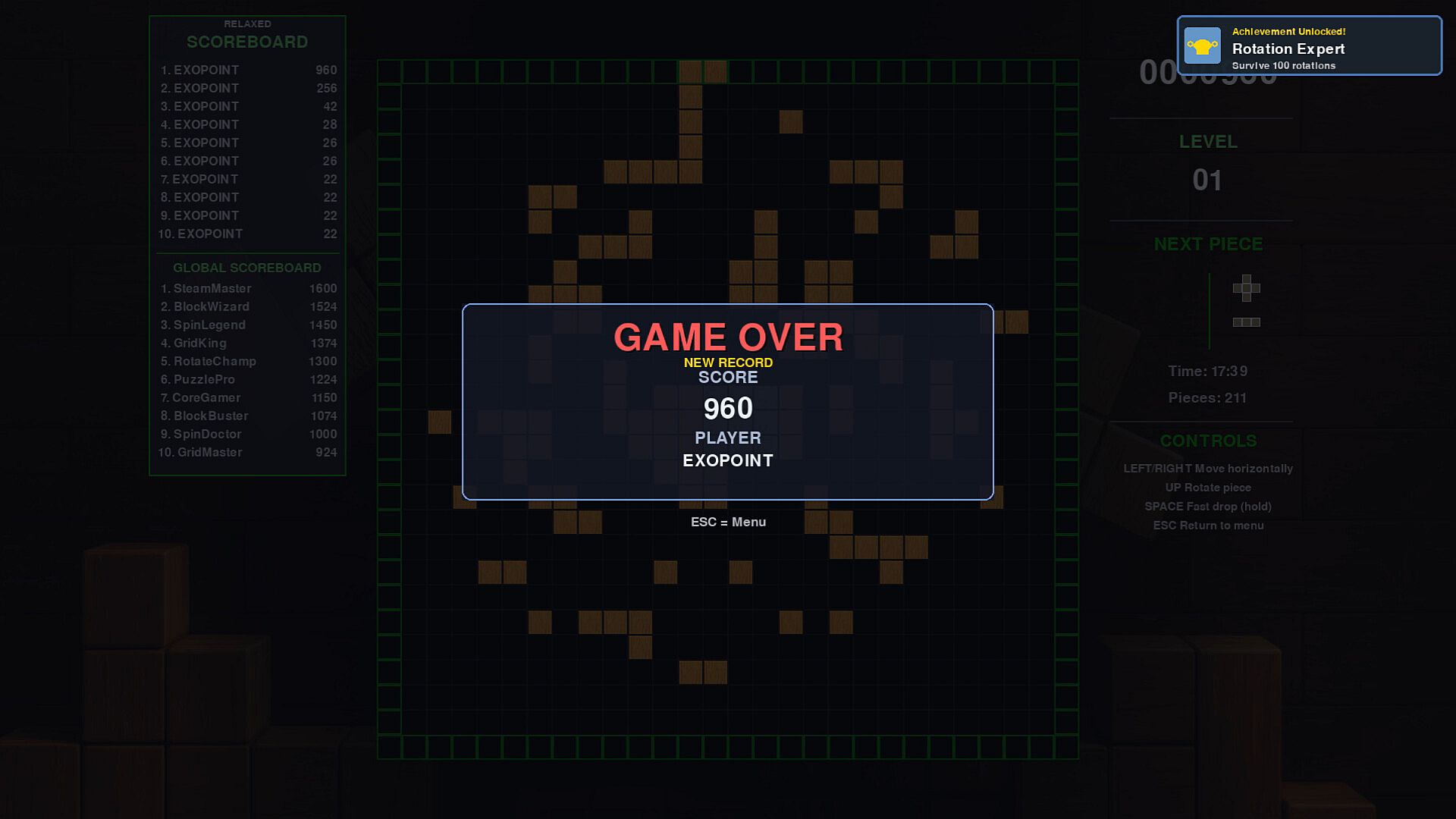 SpinGrid challenges your reflexes and strategy in a rotating arena where the rules are simple but the gameplay is endlessly engaging. Instead of clearing lines, you’ll need to create solid 3x3 block formations — all while the playfield spins and an indestructible core stone sits at the center of every match.