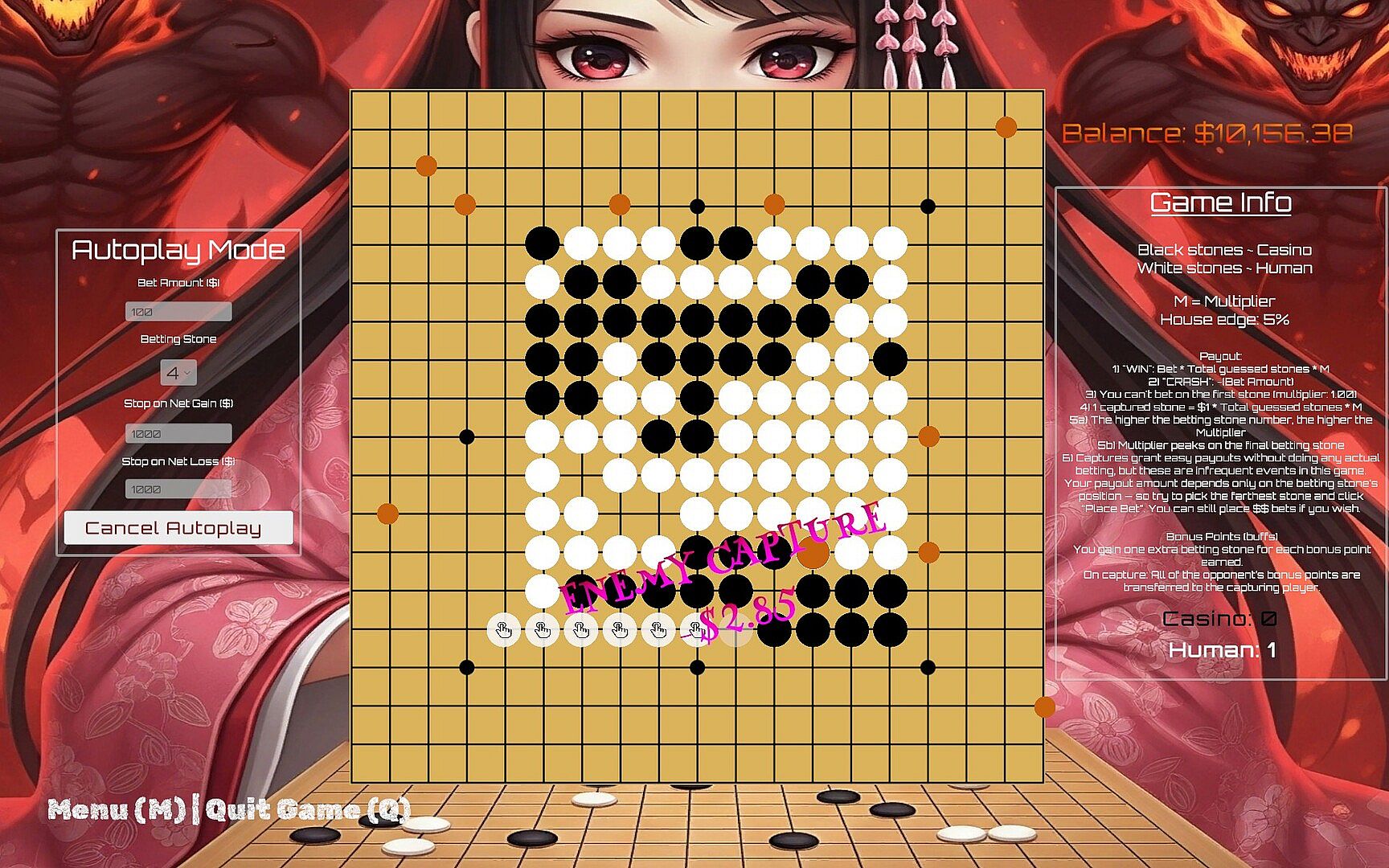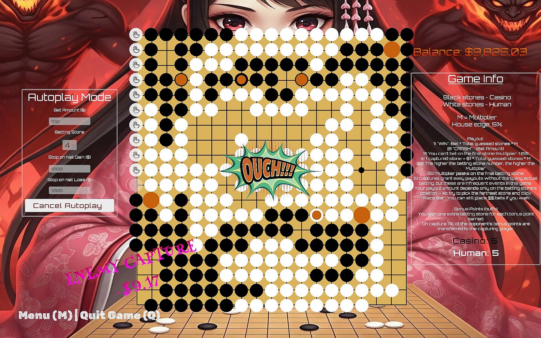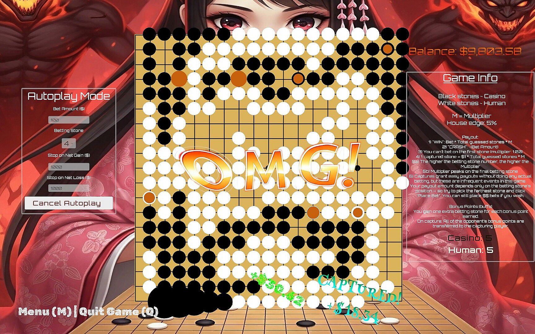 SpiralGo is a turn-based, casino-style variation of the Chinese board game Go. This version is infused with strategic betting, modern game mechanics, and fun animations. The traditional player-vs-player format is replaced by a semi-automated system: the casino (Black) places a set number of stones automatically, while you, the human player (White), wager on how many of your stones will be placed in each iteration. The casino challenges your guesses with unpredictable but patterned stone placement. Each round begins at the center of the board (aka 'tengen'). Both players place their stones in a clockwise spiral (hence, the name).