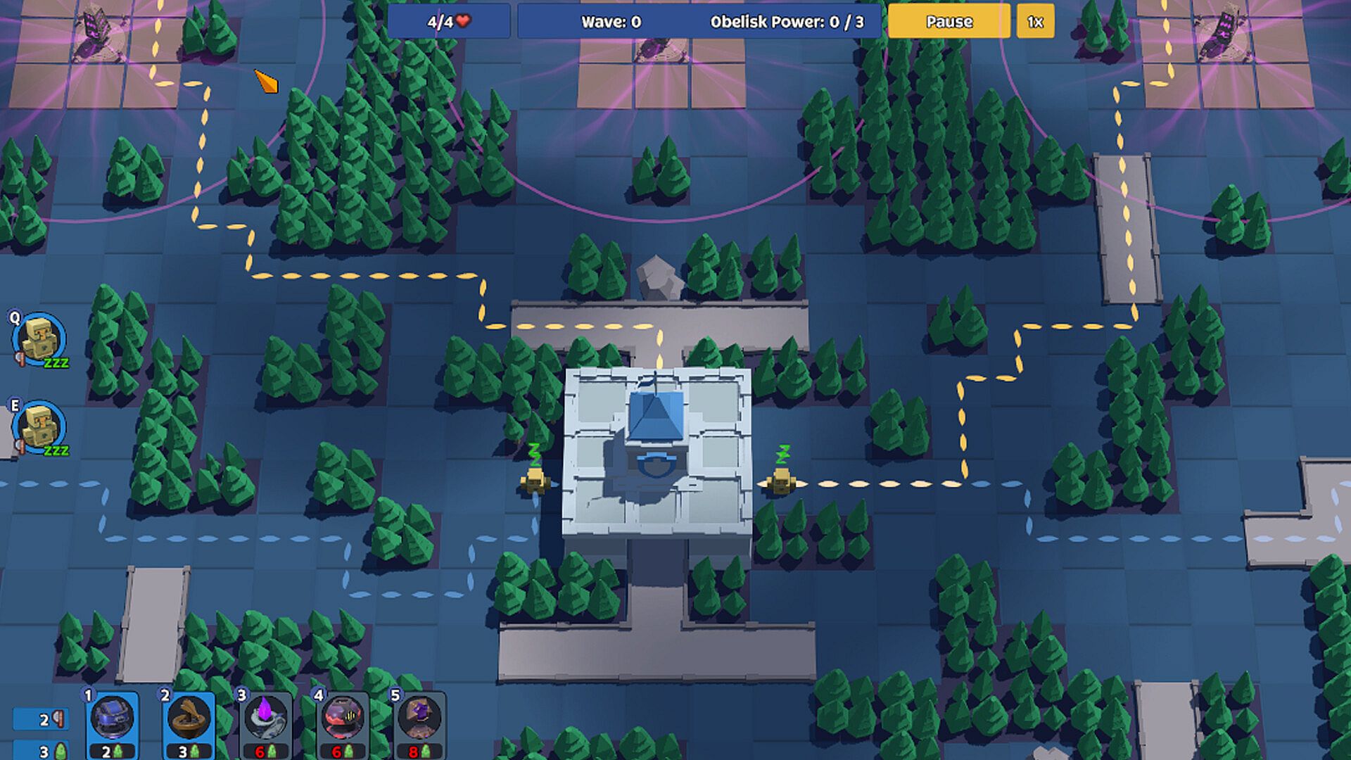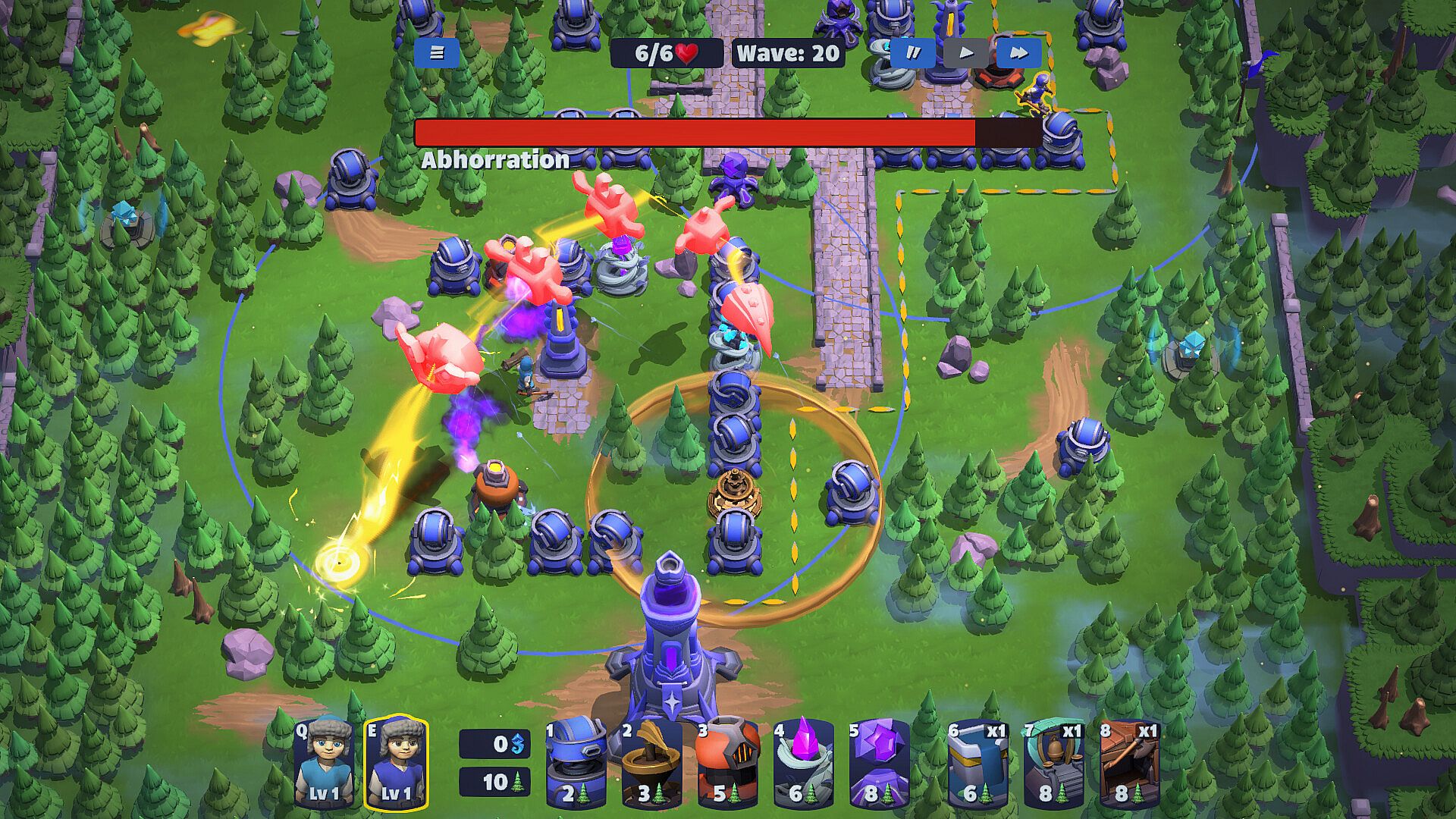 • Towers have one or two upgrade paths that build upon what makes each tower unique, sometimes adding additional effects like burning, vulnerability, or reduced move speed.