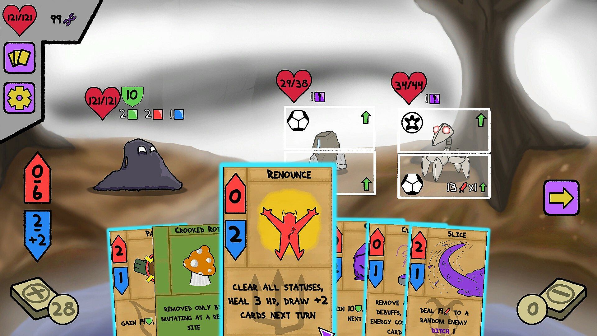 • Card based interactions: The game is largely interacted with through cards, how you fight enemies, travel through biomes, make choices in events, everything is done through playing cards to make decisions.