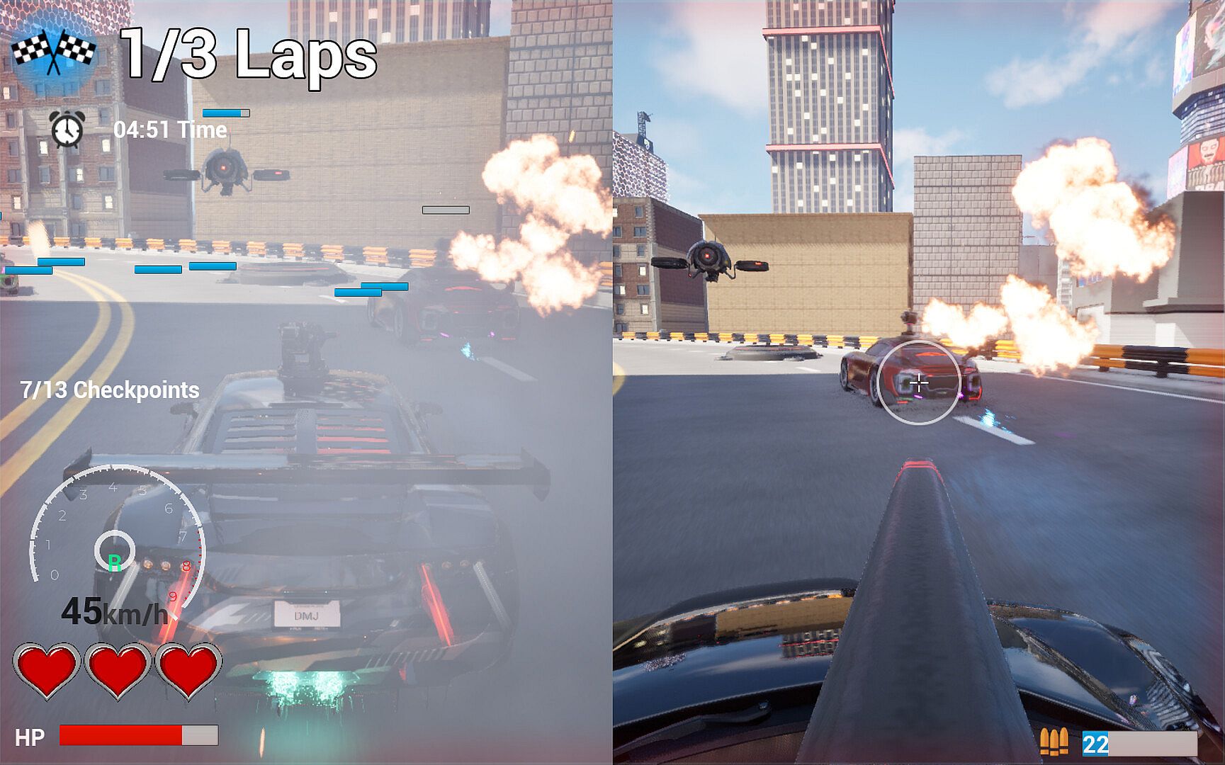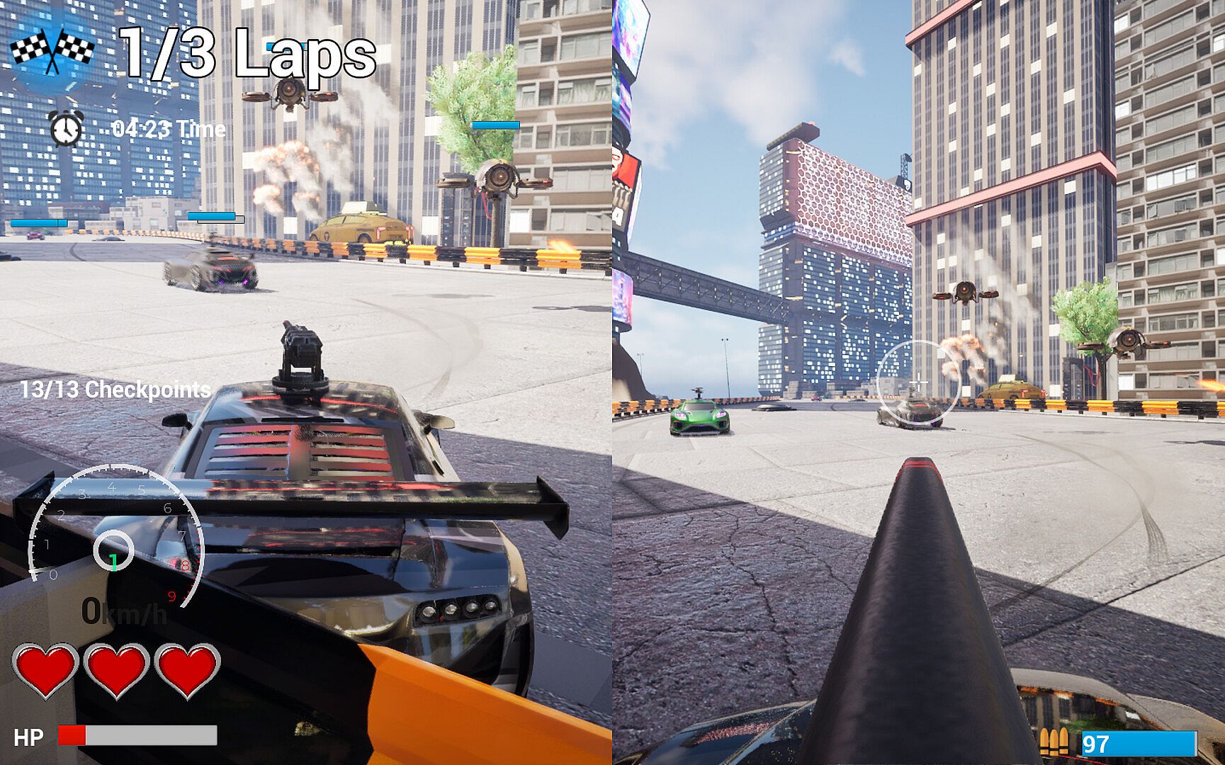 Split Racing blends time-attack racing with vehicle shooting. Your goal: finish before the timer expires. Destroy enemy cars or manage road hazards to survive—takedowns add time. Play solo (drive + shoot) or local split-screen co-op where one player drives and the other focuses on gunning.