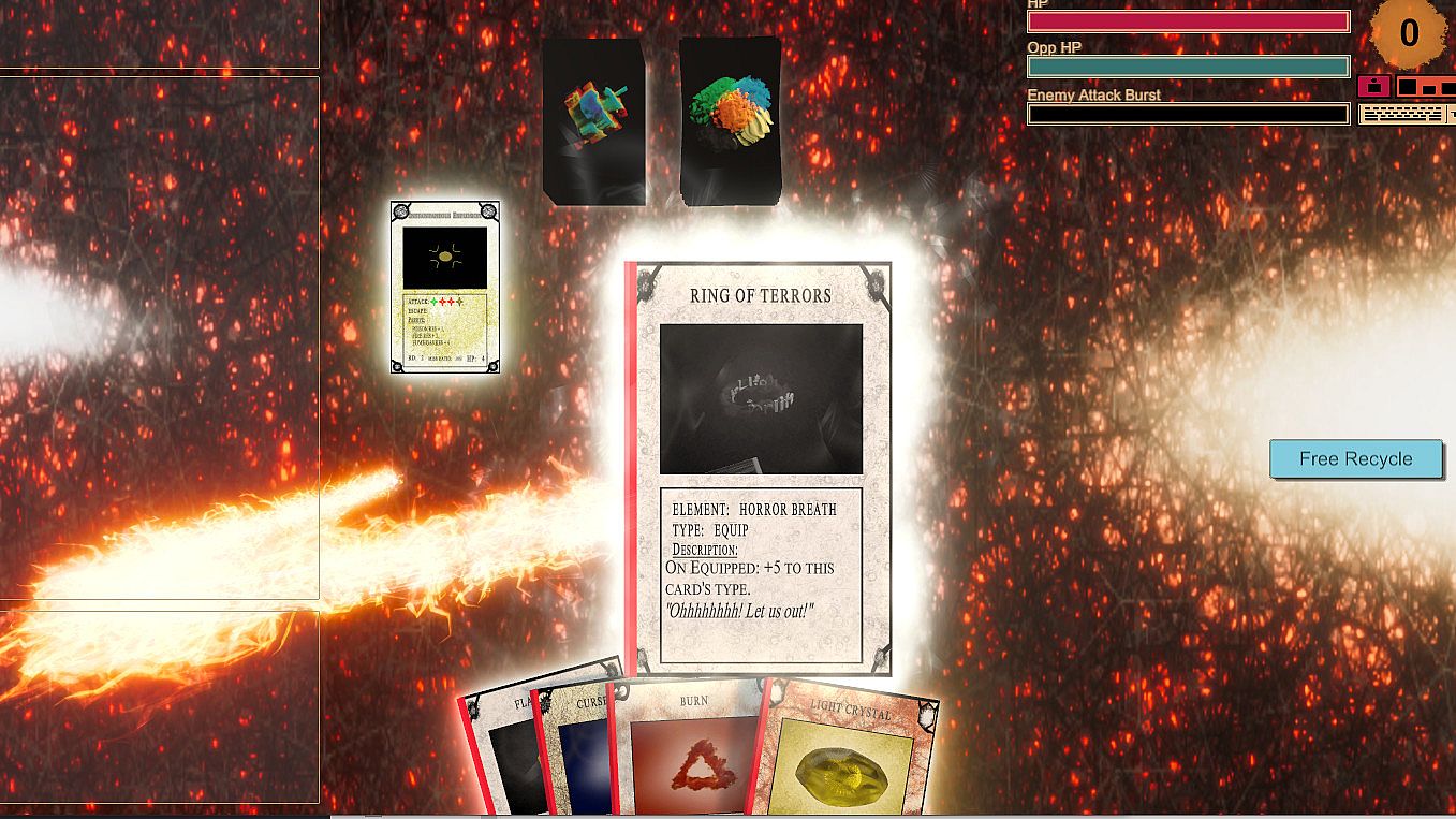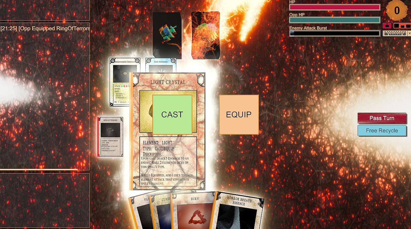 A card from the reward pile can either be cast or used as an equipment. An exception to this rule are the crystal cards. Equippingcards can make a difference as the elemental attacks become stronger. When equipping a card player also draws from the reward pile