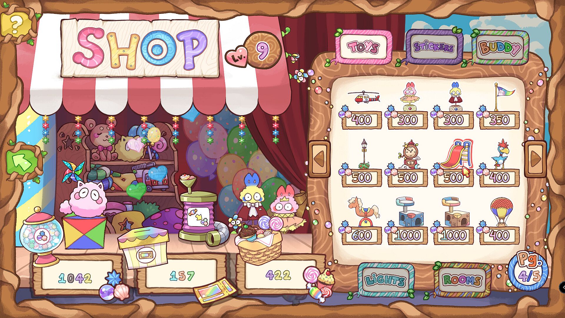 Collect candy, shinies, and tickets and spend them at the Shop! Get new items, different Spoofs, and a wide selection of other playful and fun collectables. Make a sparkling garden, a cozy pillow place, or mix and match. There's something for everyone!
