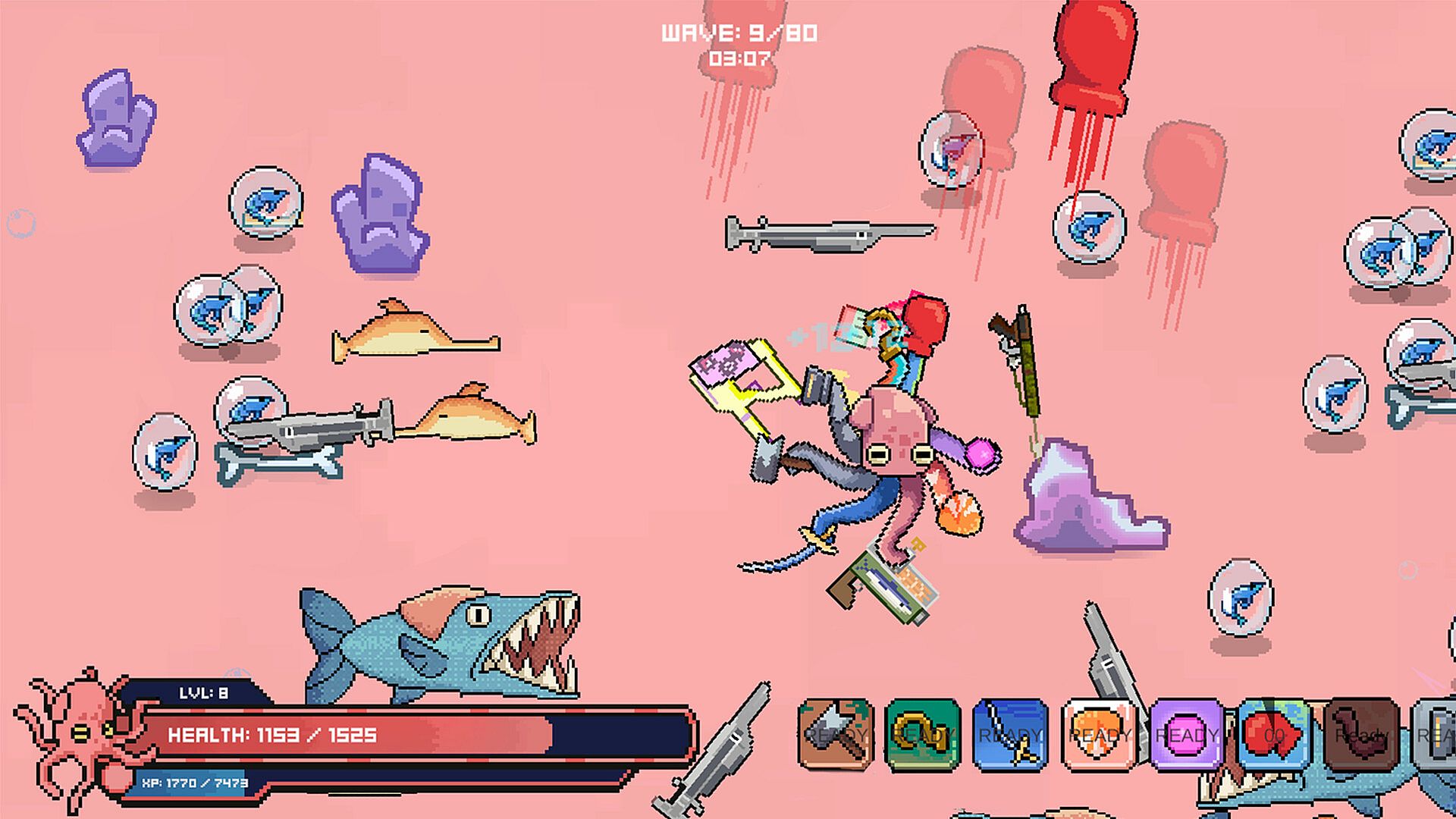 Now, in this fast-paced underwater roguelike, Squidly fights back using whatever weapons his enemies drop — from mantis shrimp knuckle dusters to barnacle blasters. Every run is randomized, chaotic, and packed with cartoon mayhem.