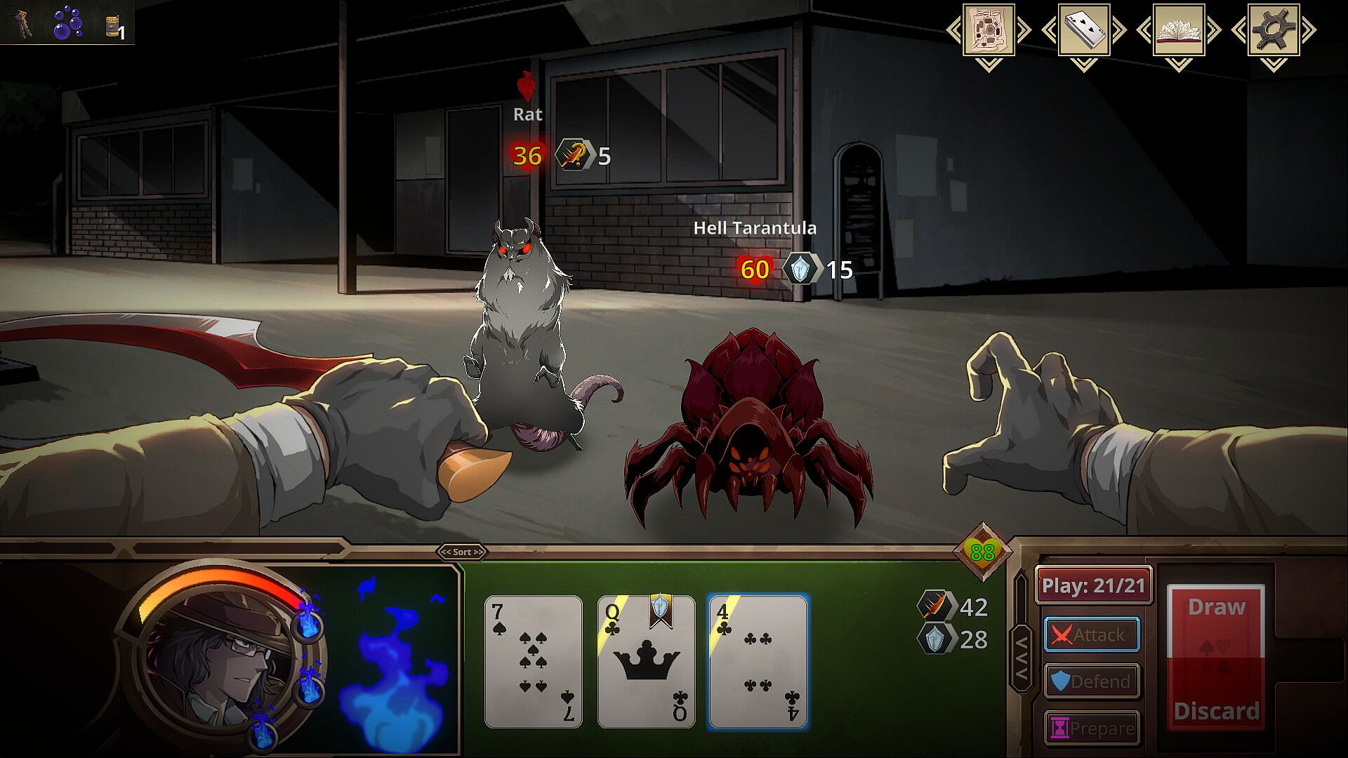 Draw cards from your deck to empower one of three actions: Attack, Defend, and Prepare. A total of 21 produces exceptional results, but going over is a Bust, and will forfeit your action. An arsenal of modifiers, backgrounds, and items allows you to build a unique deck and master a play-style that is completely your own.