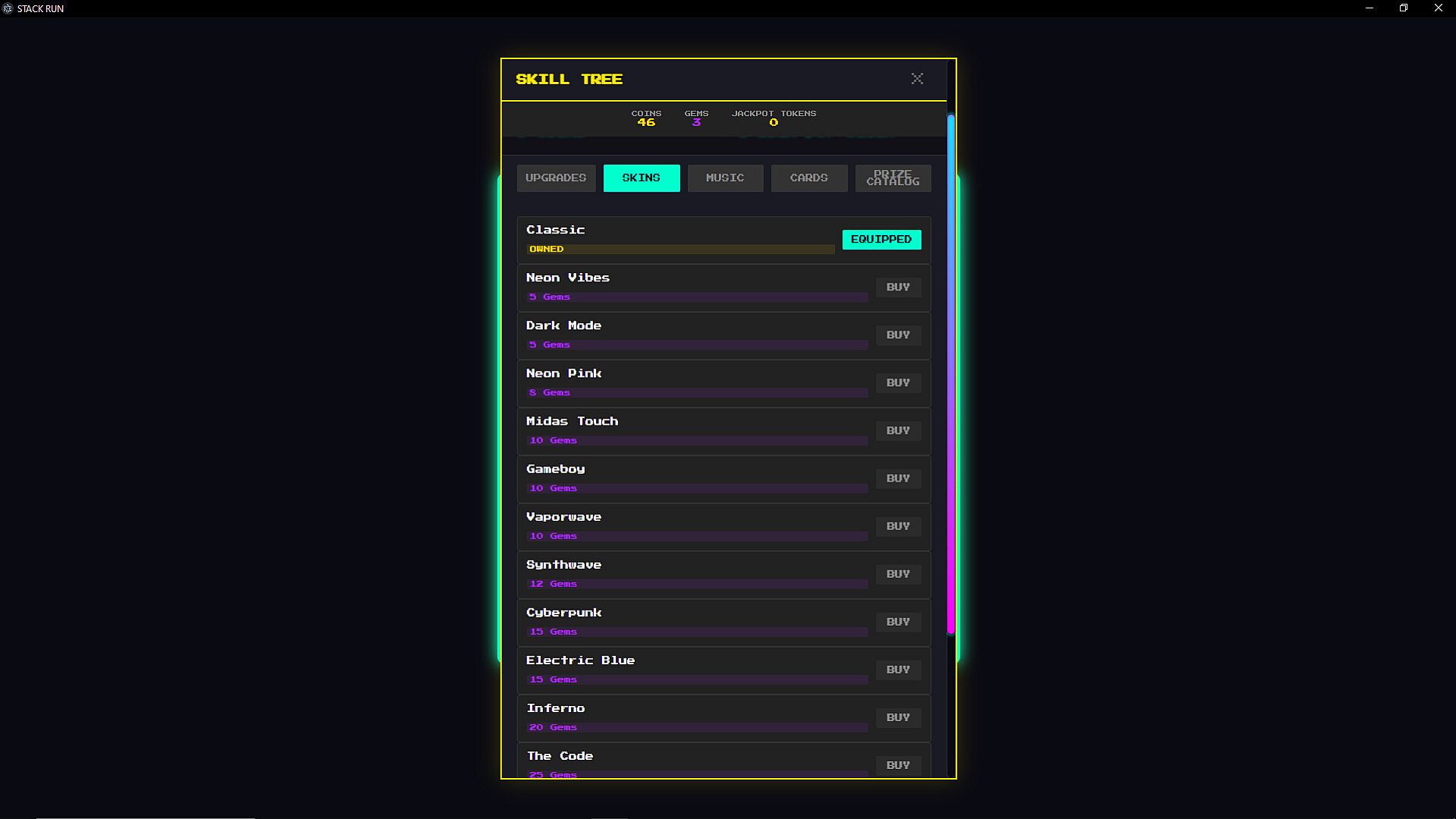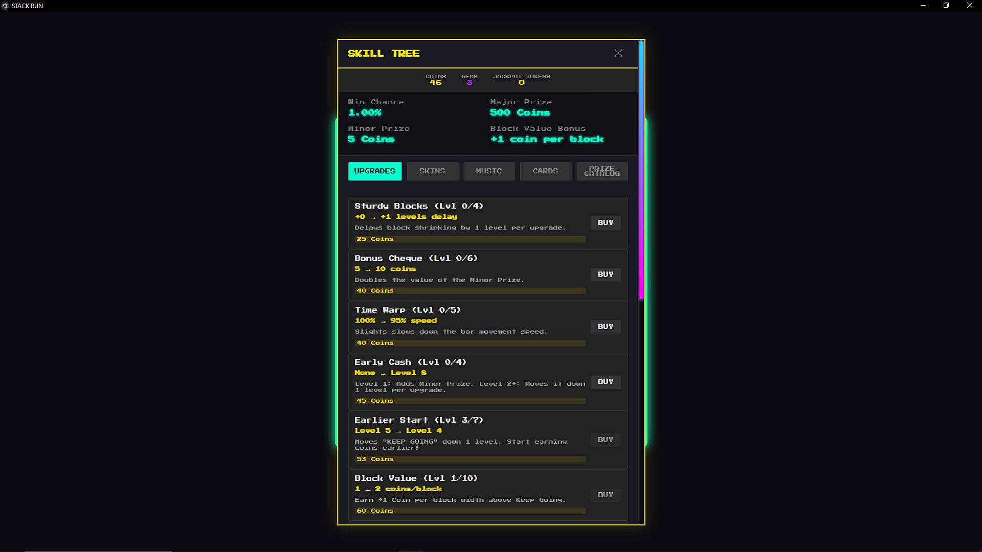 Unlock upgrades, discover modifier cards, collect skins and music tracks, and earn arcade prizes. Each run resets, but your progress carries forward through a deep upgrade system.