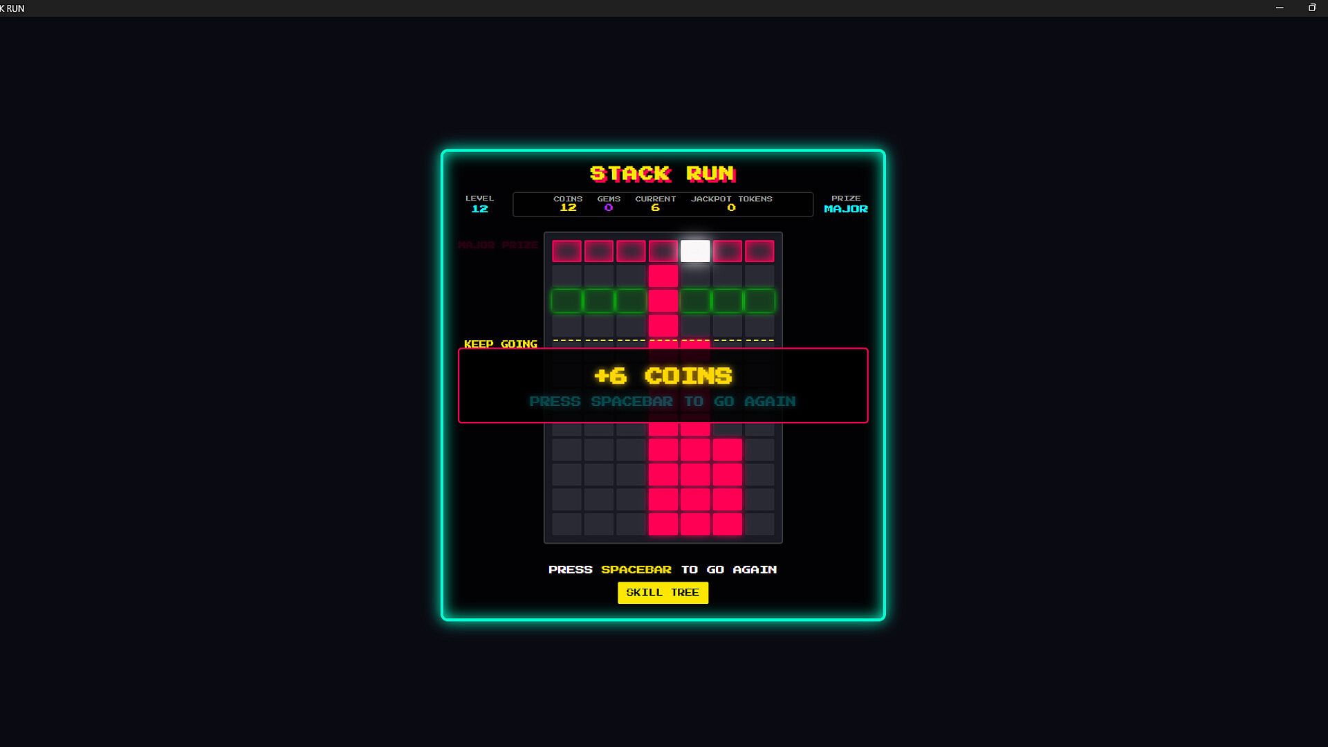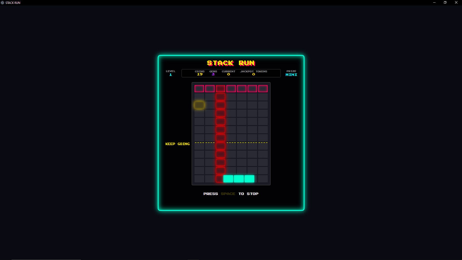 STACK RUN is a skill-based roguelike arcade game where precision timing meets neon aesthetics. Stack blocks by stopping a moving bar at the perfect moment, climb to Level 12, and claim the jackpot.