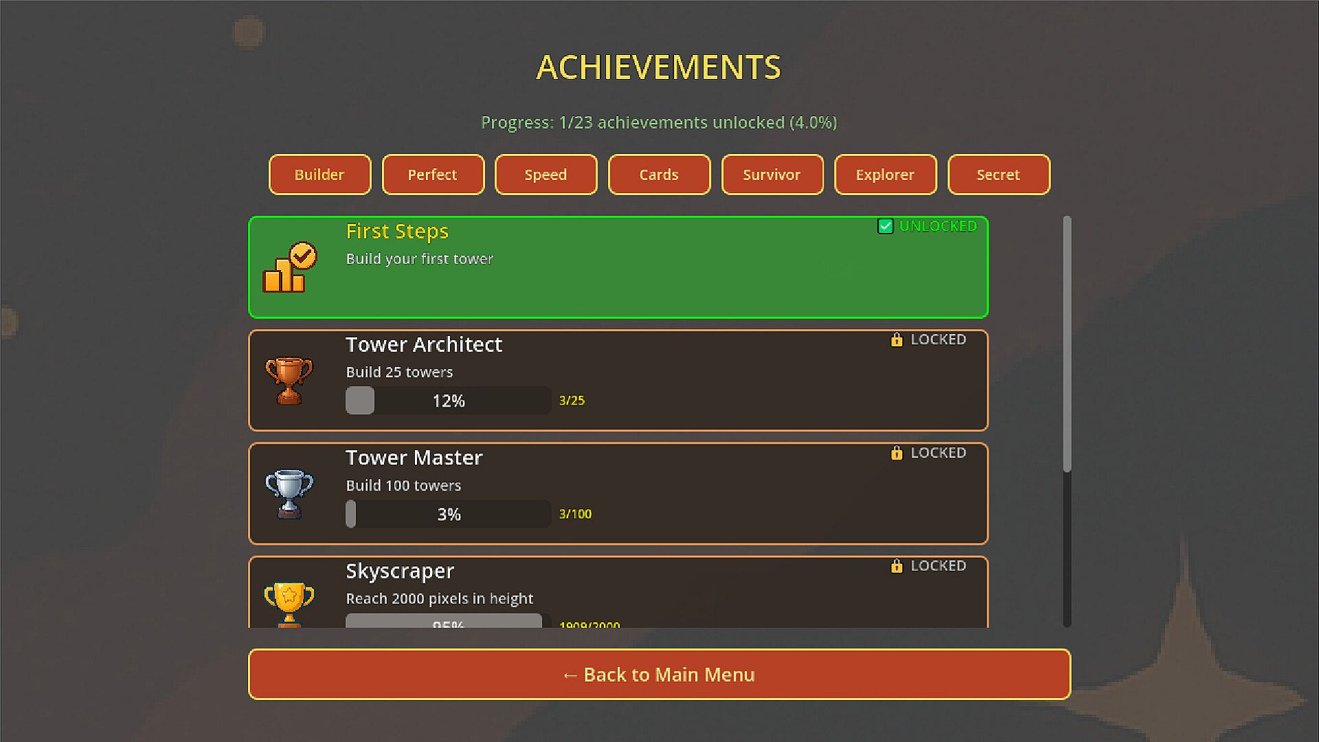 - Achievement System: Unlock rewards across Builder, Perfectionist, Speedster, and more categories