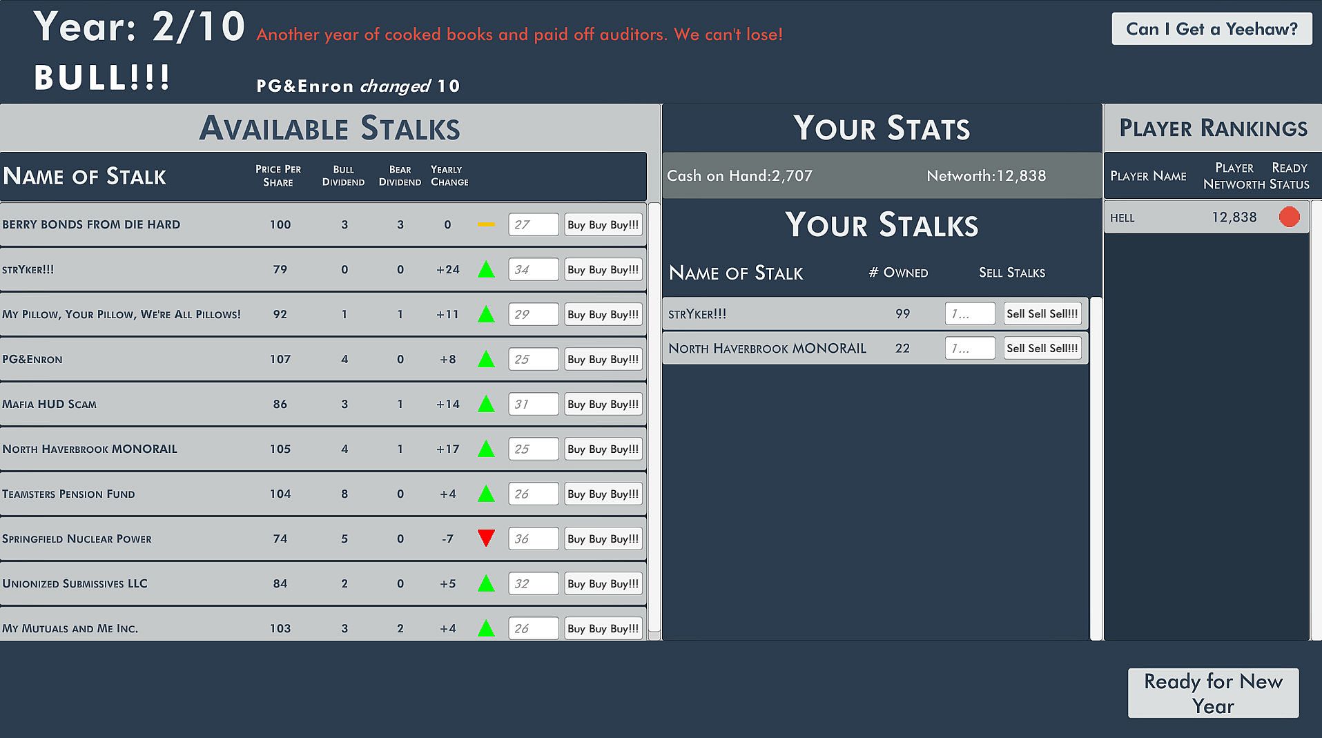 Compete against your friends, strangers, or no one and try and buy and sell stalks to make money. The player with the highest number wins! Everyone else loses! If you get the highest number, congratulations! If you get the lowest number, well, at least you didn't lose anything of real value...