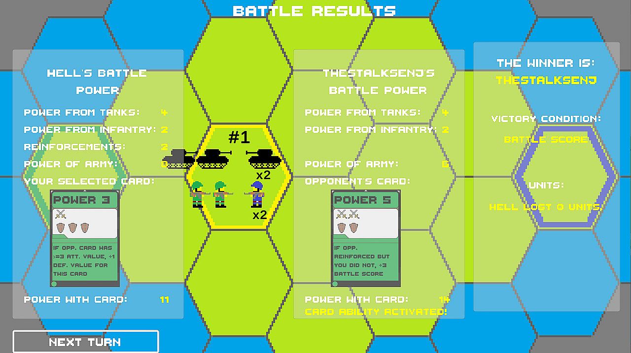 Also include is the beta of CardConquest, a two player, turn based strategy game where players try and capture their opponent's base or destroy all their units. Choose between the Infantry Commander and Tank Commander and fight for supremacy on your tiny island. There is no luck or RNG involved in winning battles. It is all based on your armies combined power, which is modified by the card each player chooses to modify their attack power. Cards can have special abilities that will alter the outcomes of battles if specified conditions are met. Good luck battling!