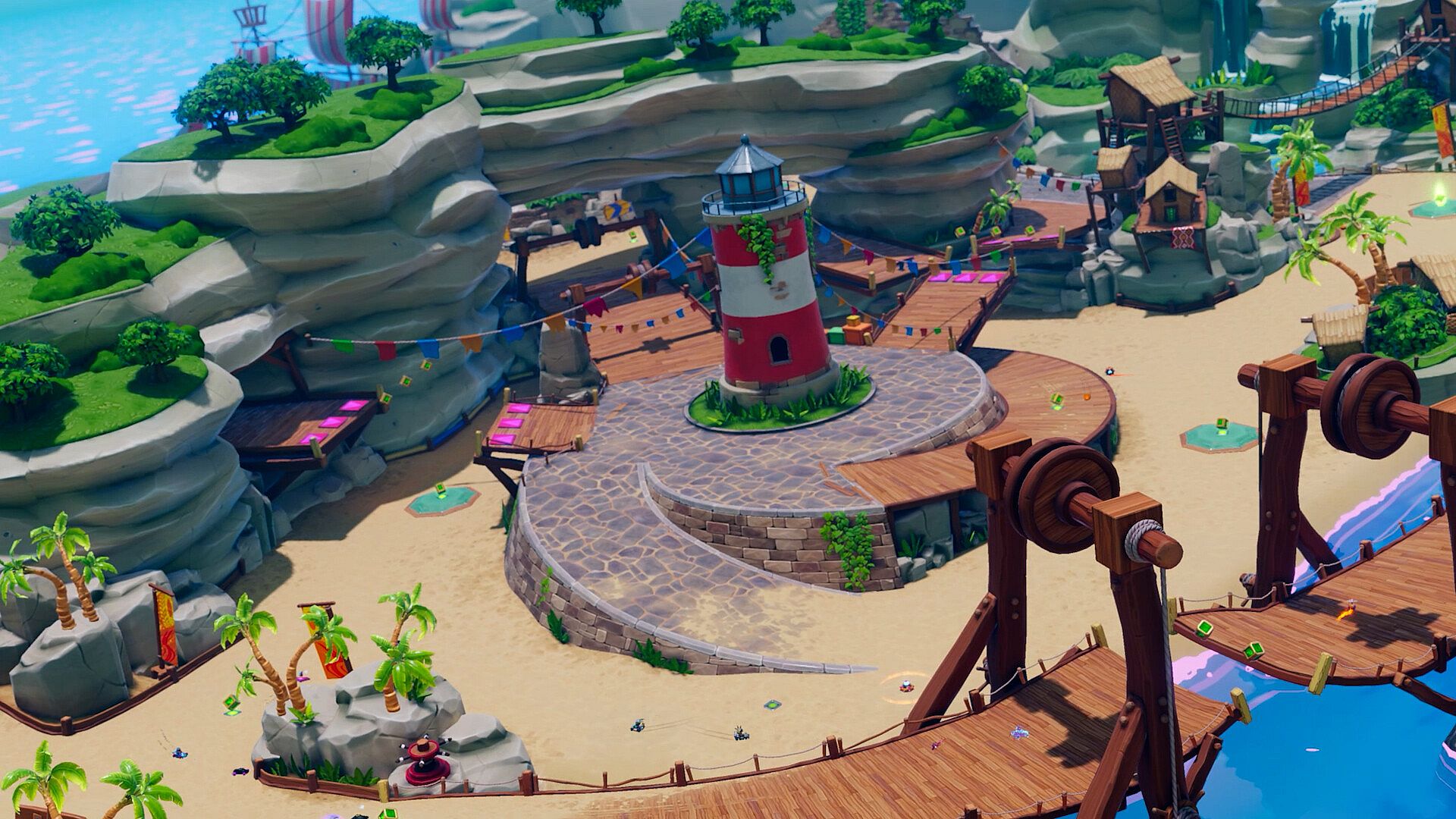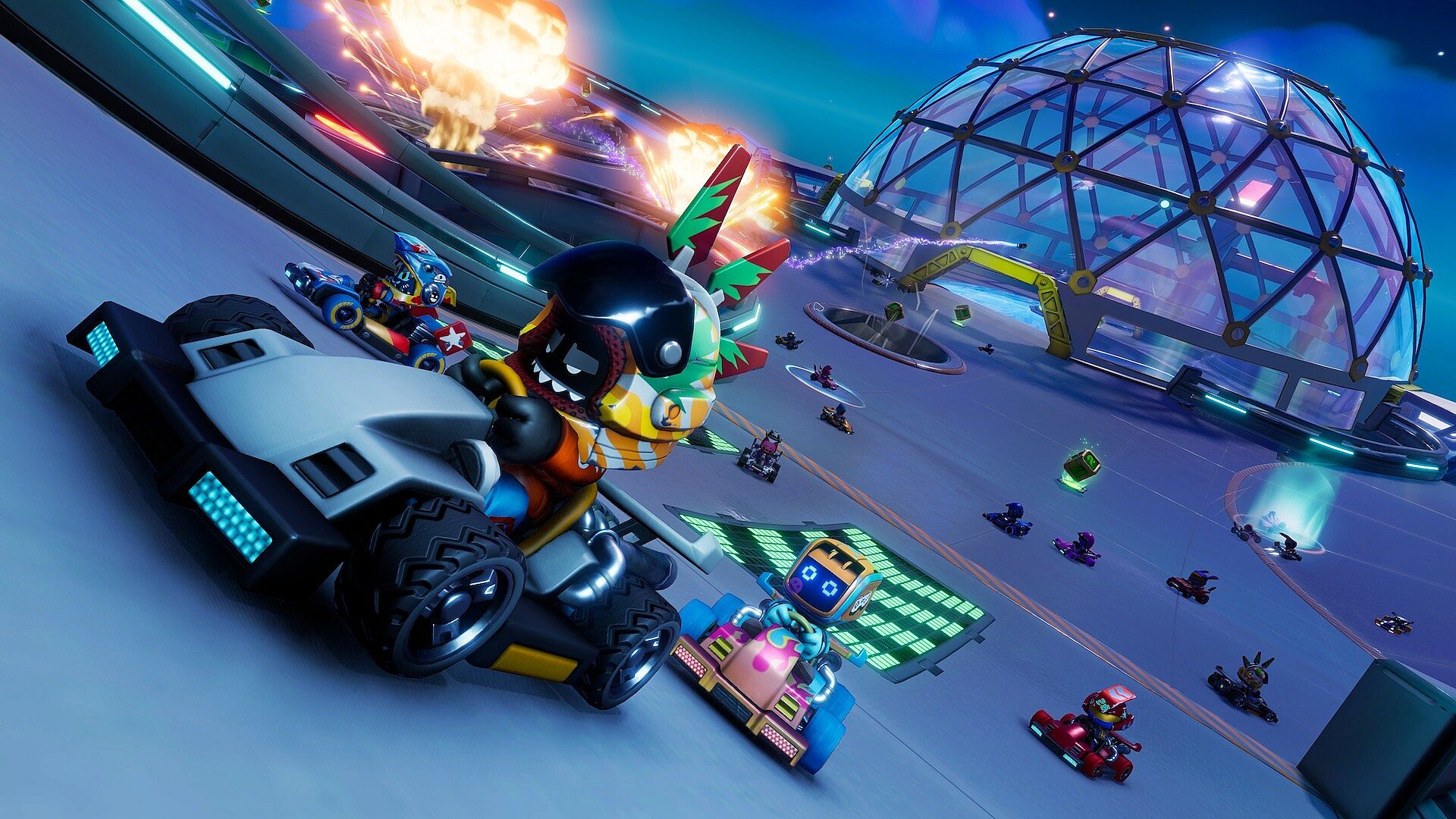 Stampede: Racing Royale pits 60 players against one another across three-round eliminator events, culminating in a high-stakes finale to crown the winner. Rounds include Stampede Races, which offer classic karting action on outrageously inventive circuits against up to 59 other opponents, and Stampede Battles, where competitors are locked in power-up laden arenas to fight their way to victory.