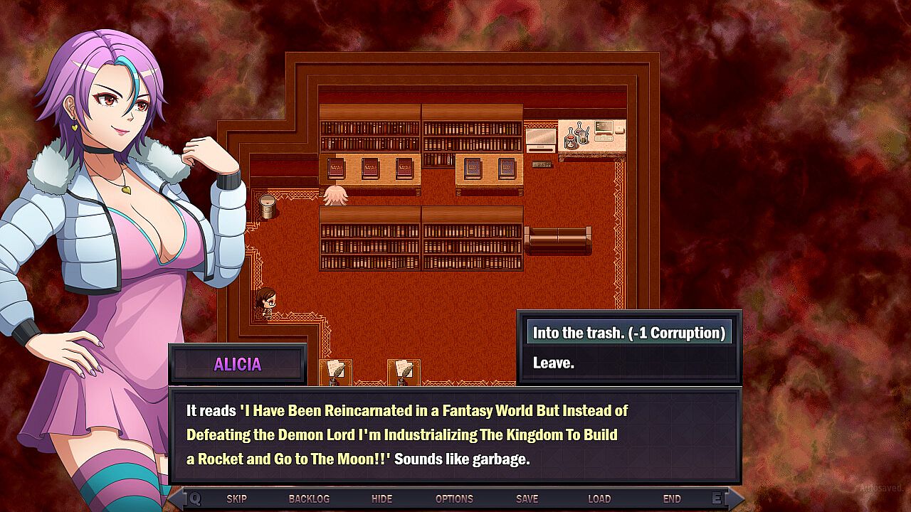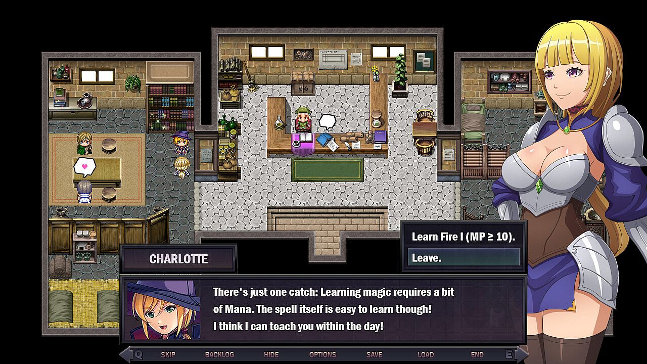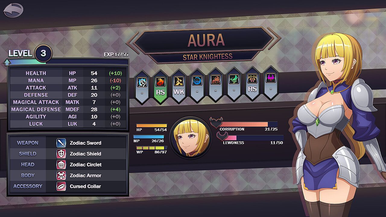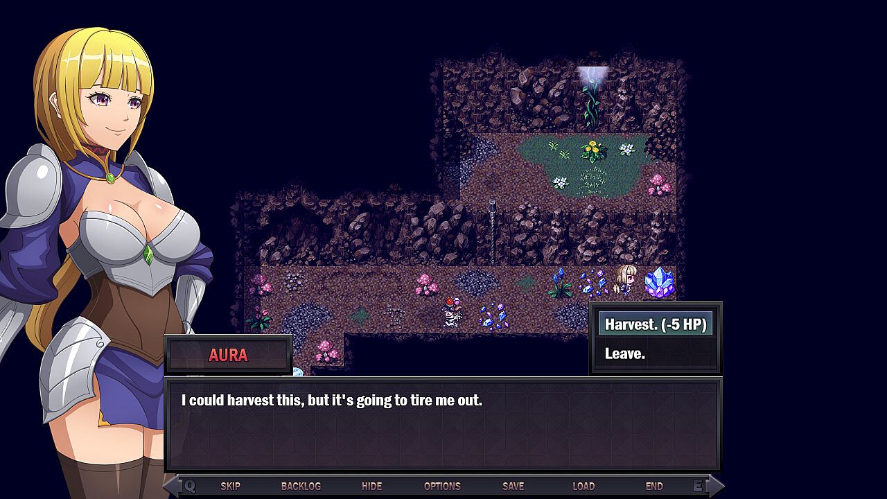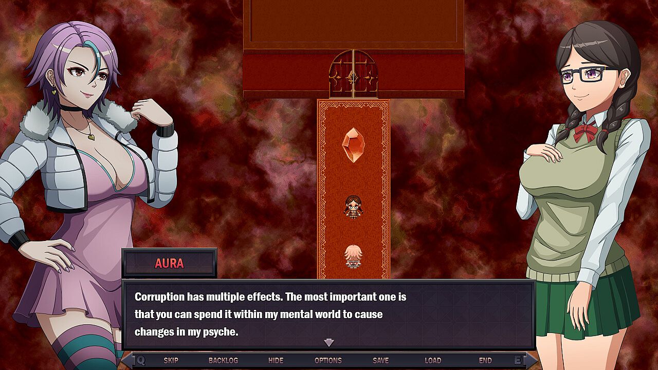 • The player controls Aura and can explore the world of Roya to track down and kill the Demon King. In order to become stronger, acquire funds, and advance her search, she can rely on her own powers or ask people for help. However, not everybody means well with Aura. Performing lewd acts and compromising on Aura's ideals by allowing innocents to suffer causes Aura to gain corruption.