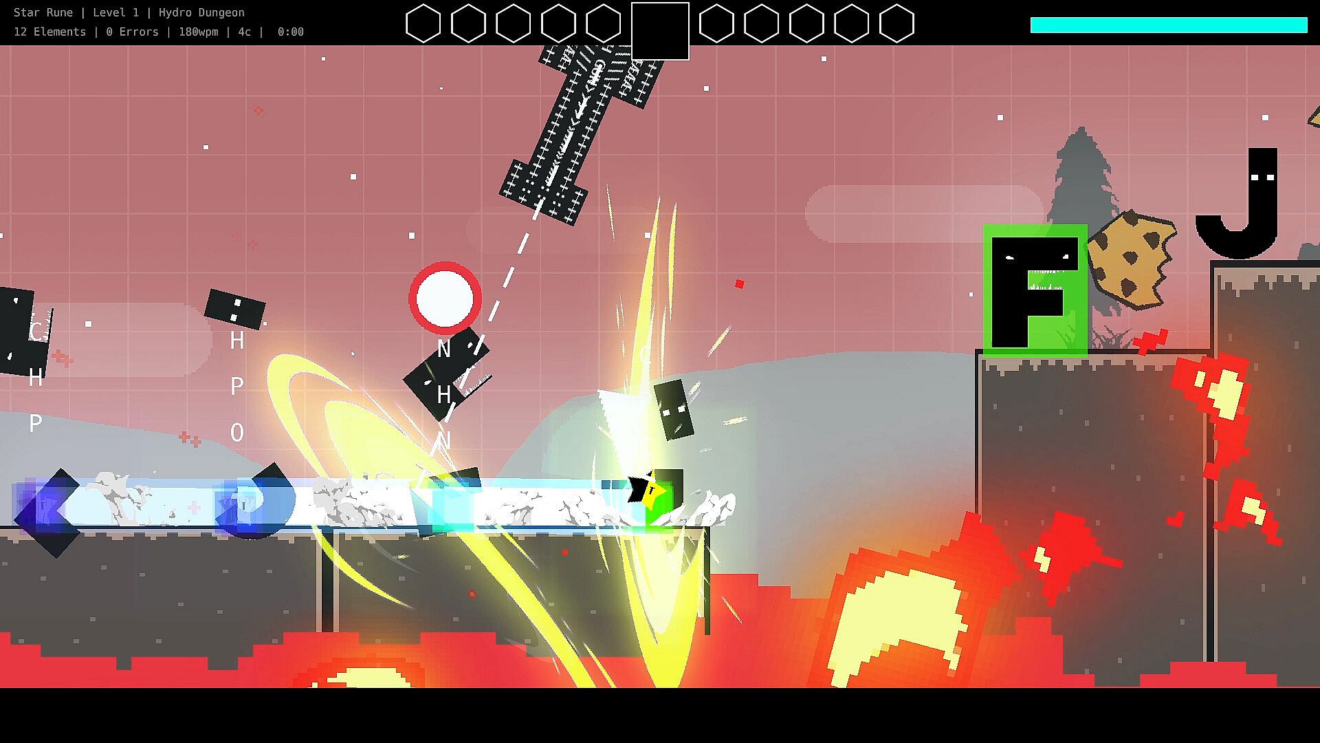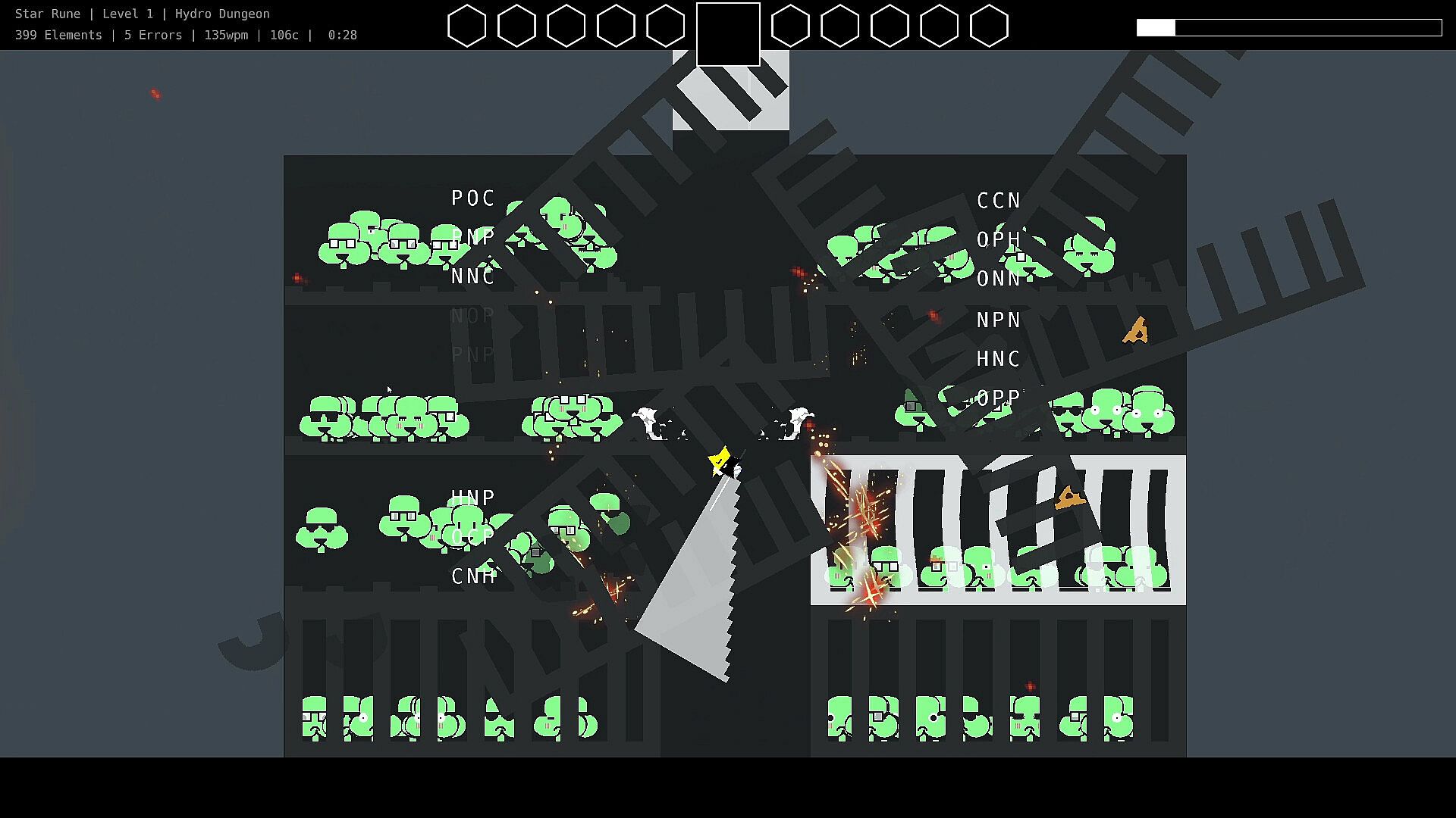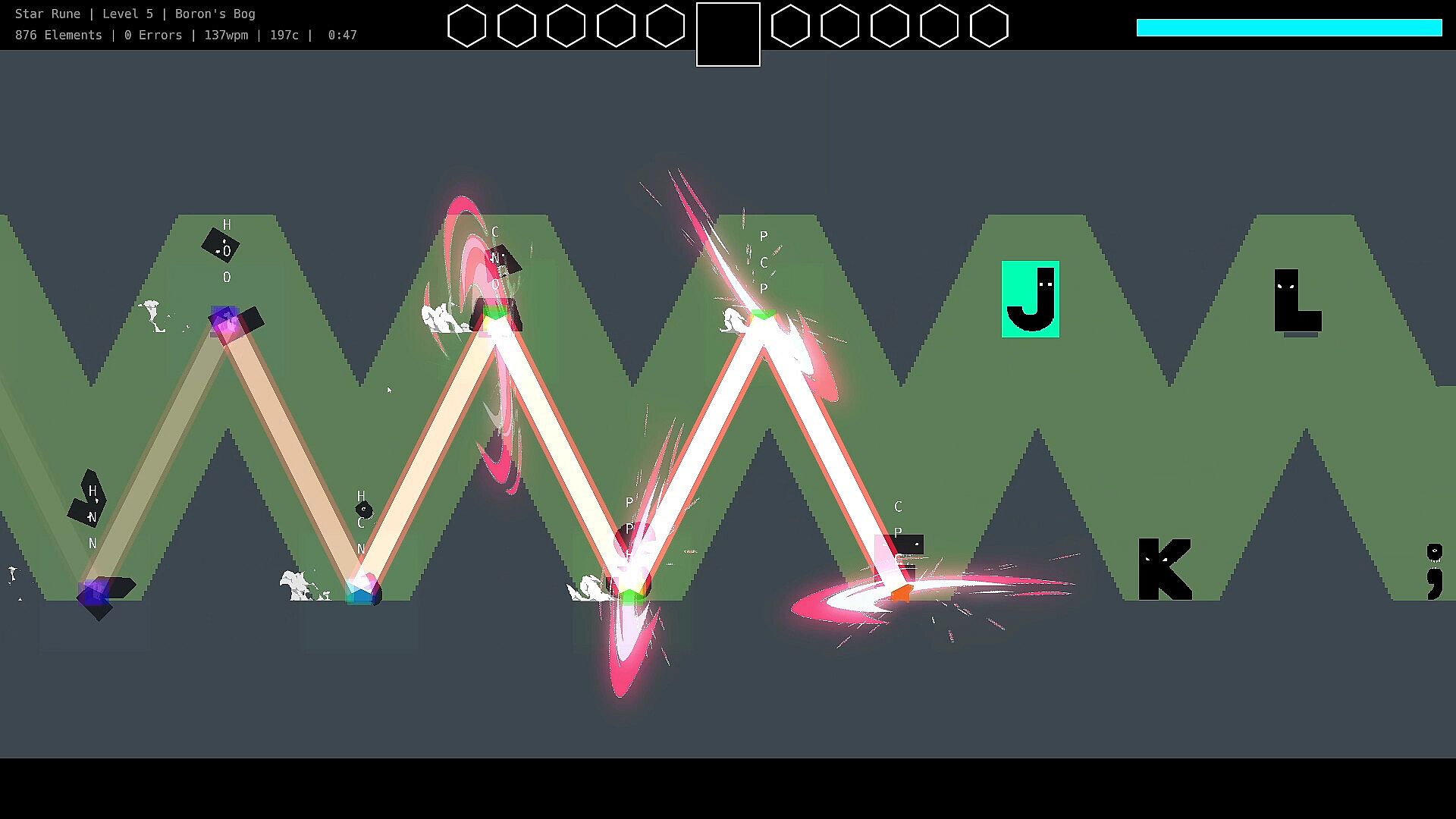 In Star Rune, every single stroke is rewarded. Explosions, sliced letters, falling enemies, treasure, dashing across the screen, etc... these are all performed by single strokes. This is especially important to kids/new typists who struggle to find one key at a time. But for those who type fast, you'll feel a rush you won't forget.
