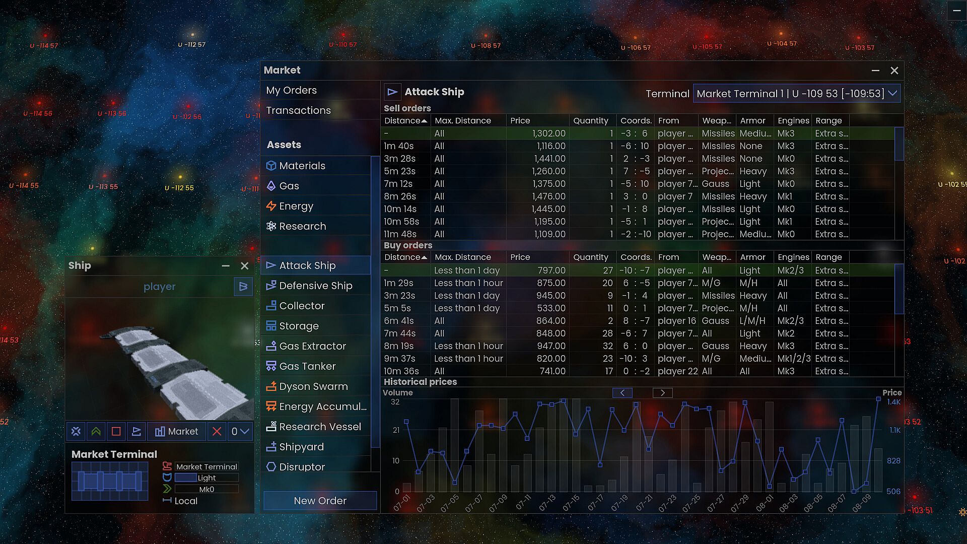 Spaceships keep operating even when the player is offline: production spaceships keep harvesting resources, and combat spaceships automatically engage invading spaceships. To allow players to mount proper defenses against large attacks, they can build disruptors to slow down travel from enemies to their systems for up to 24 hours.