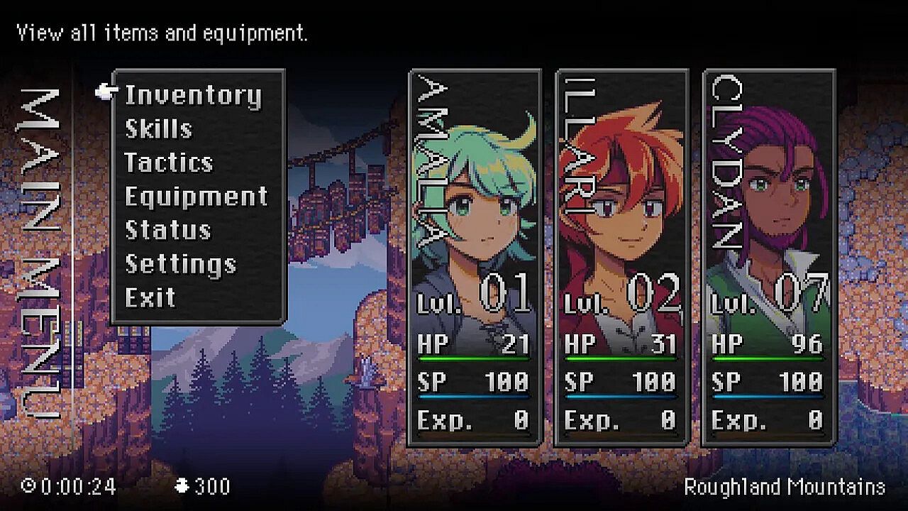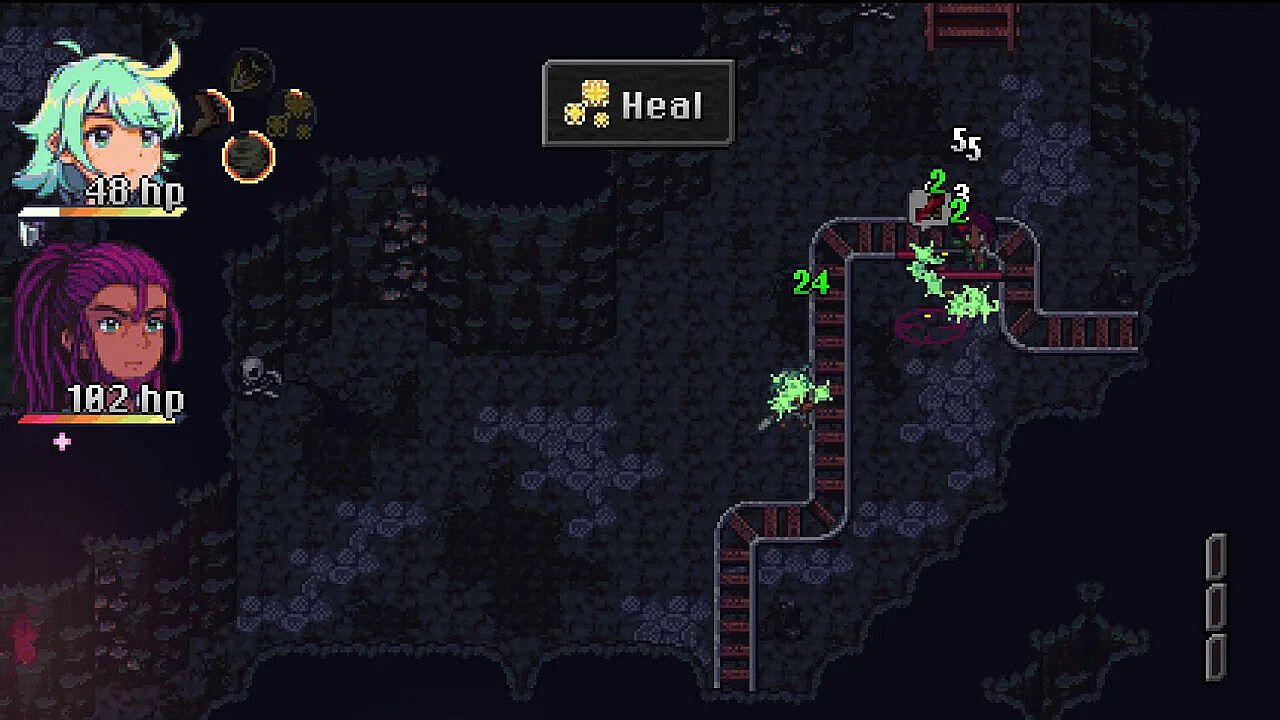 • Choose from cooldown-based skills. No magic points to manage; HP replenishes after battle if your party is in good spirits.