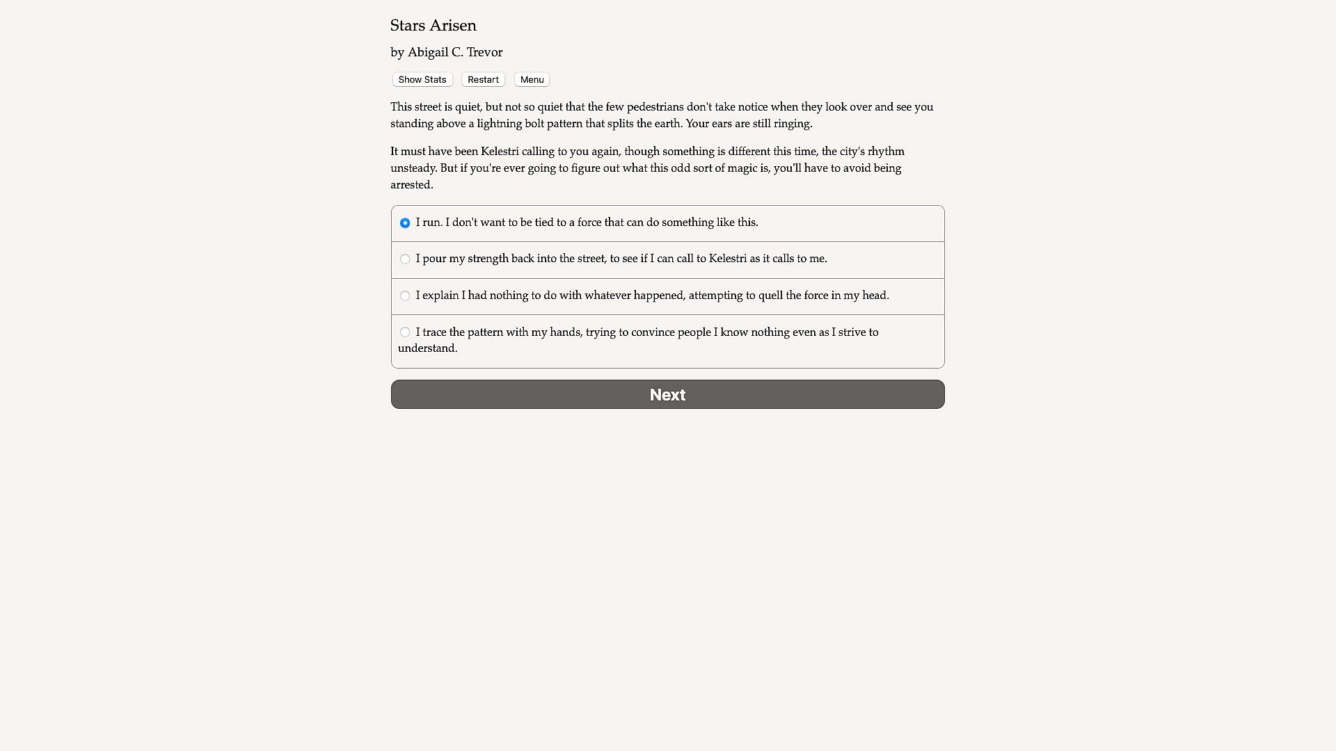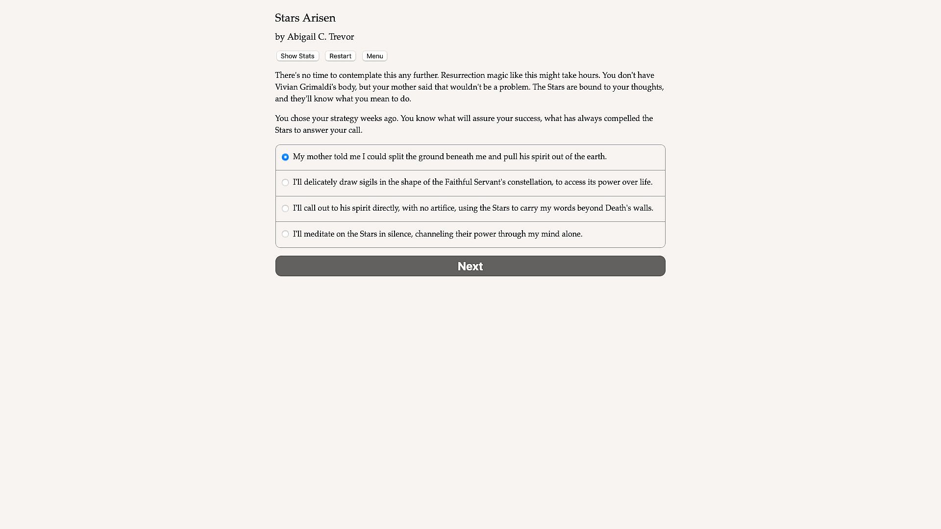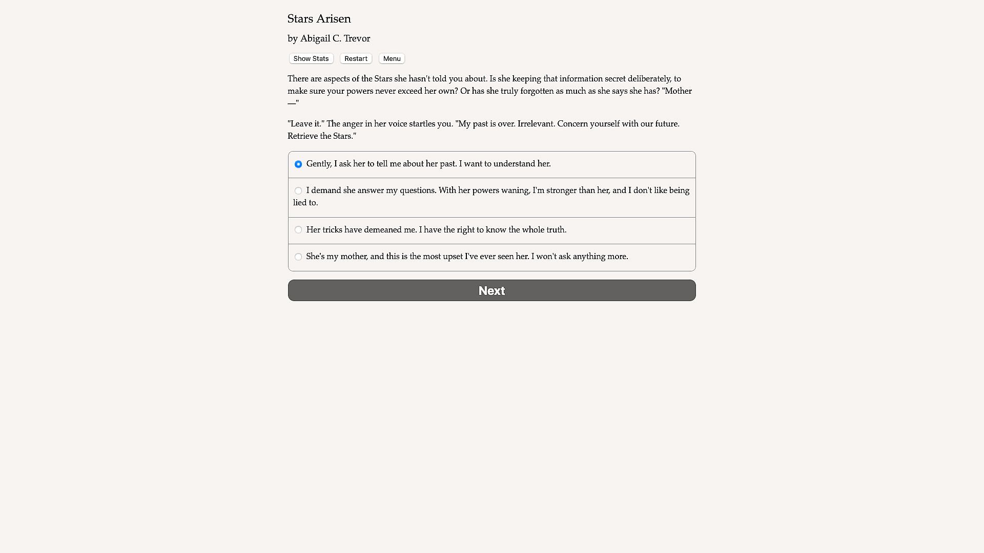 Stars Arisen is an interactive novel by Abigail C. Trevor. It's entirely text-based, without graphics or sound effects, and fueled by the vast, unstoppable power of your imagination.
