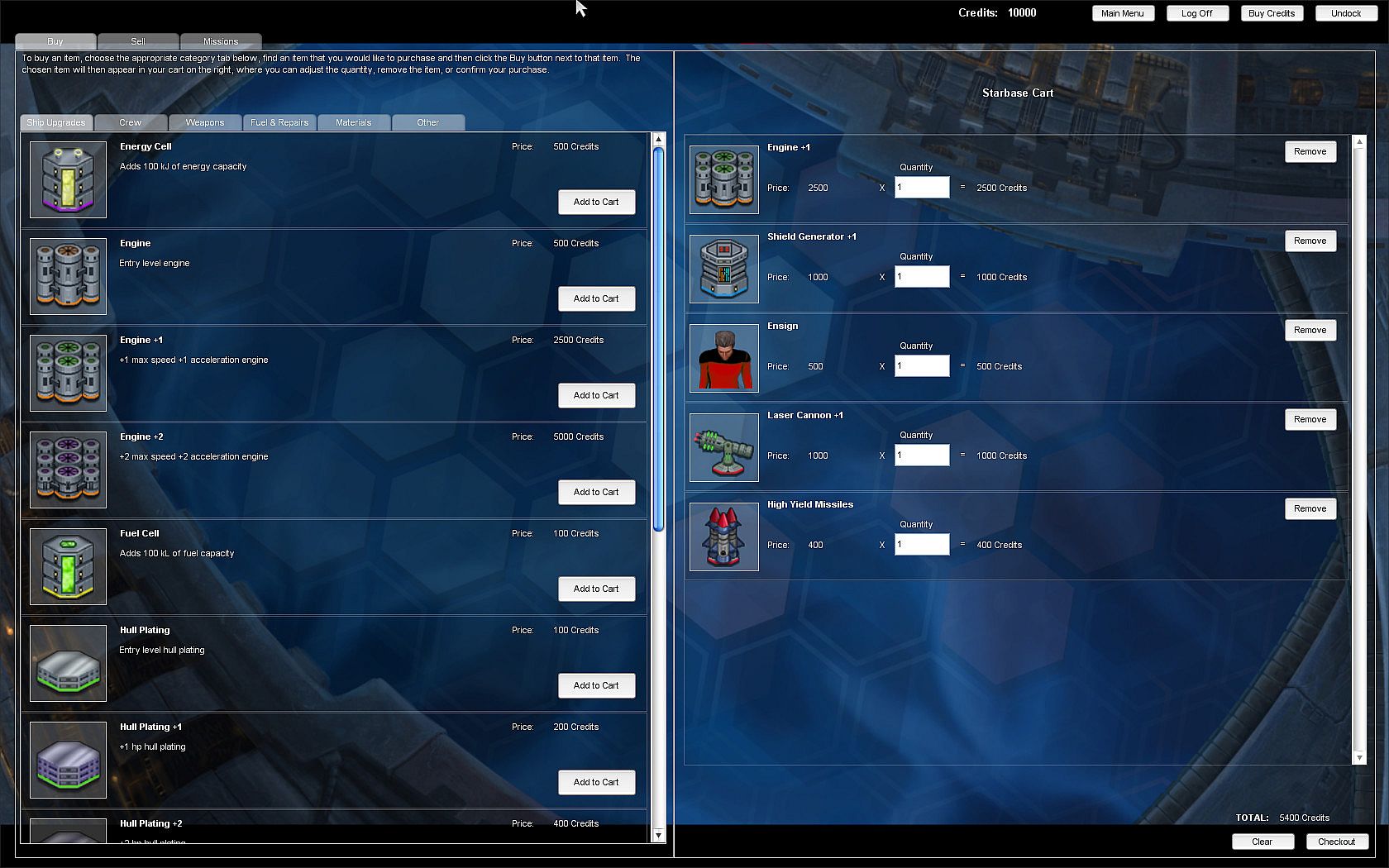 Each galaxy has one or more starbases where you can dock your ship for safety and upgrade your ship's shields, hull plating, weapons, scanners, crew and more. You can also sell acquired items and raw materials that were mined from asteroids and ship remains.