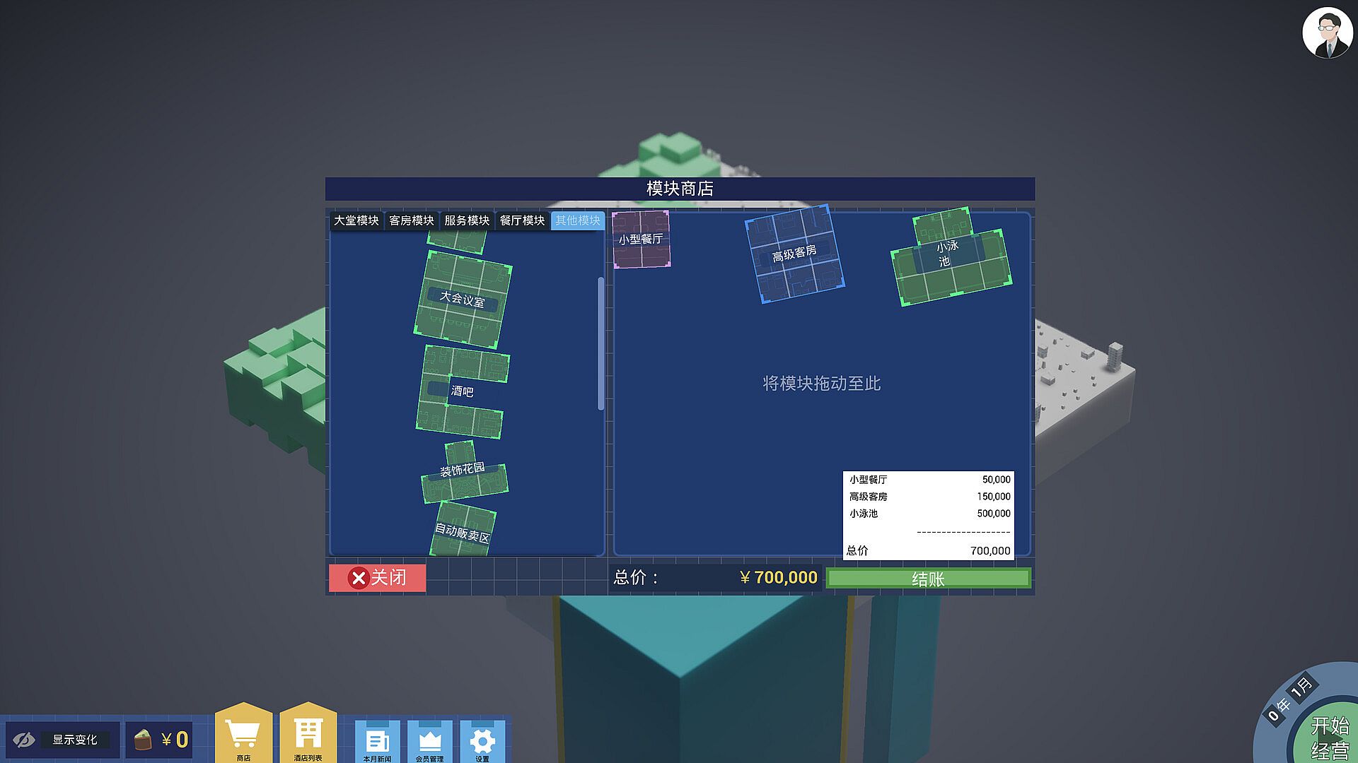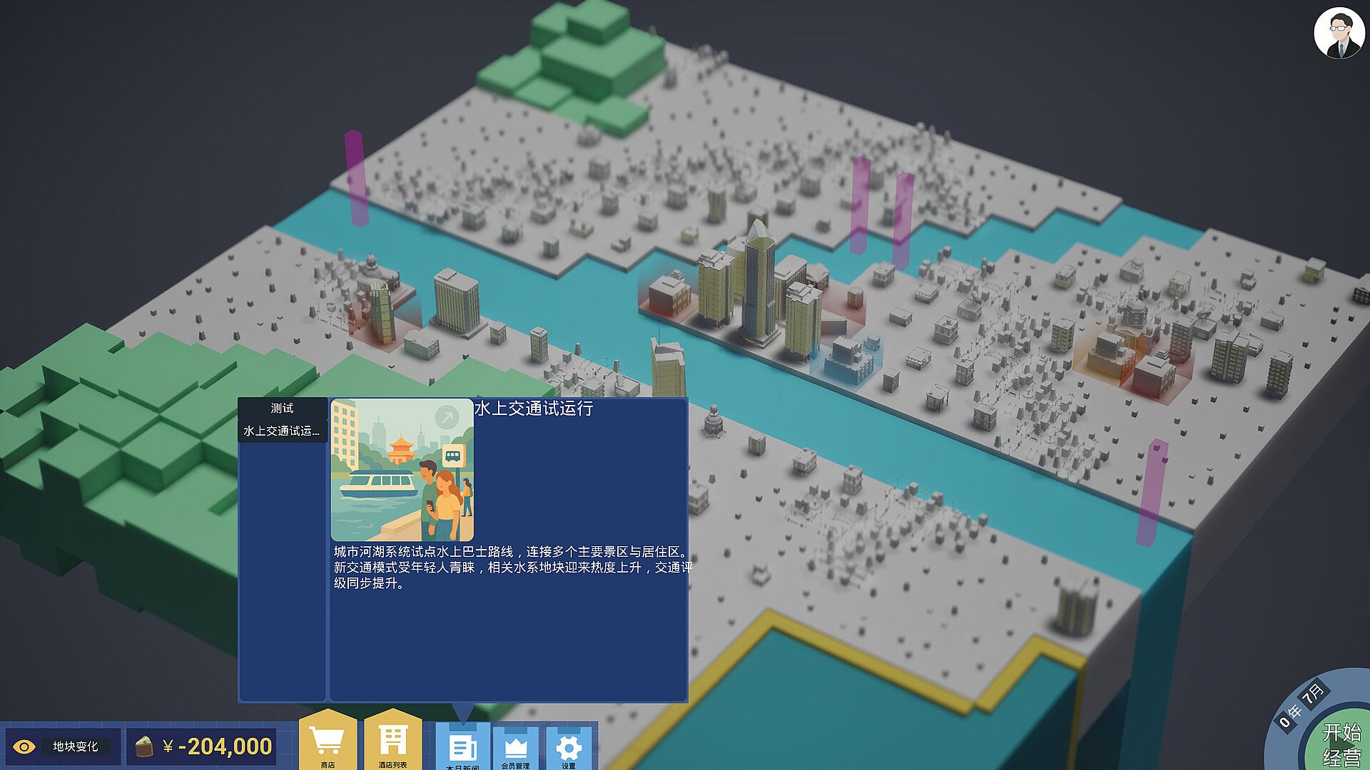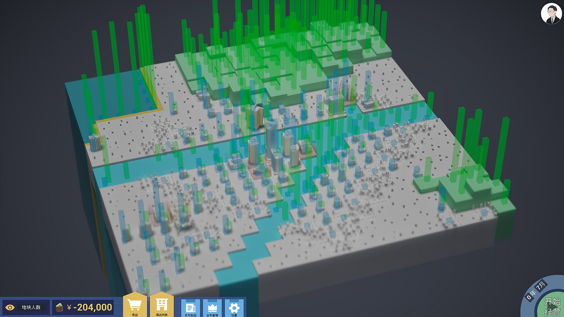 Start small and expand strategically across a grid-based city. Every choice — from your clientele to your facilities — shapes your hotel's fate.