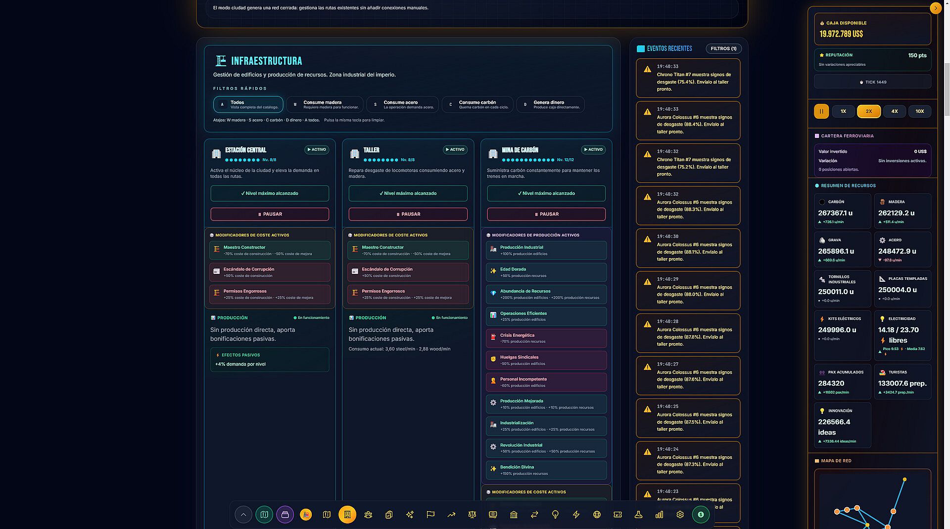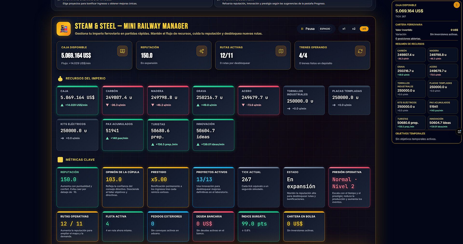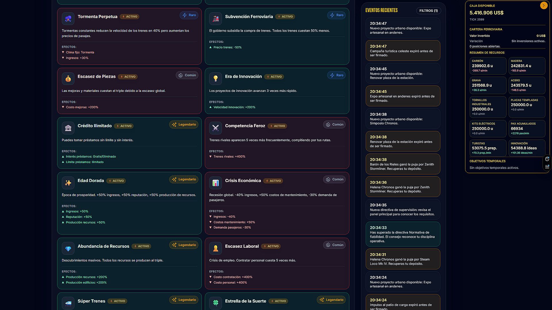 • Stock market: invest in six corporations with systemic behaviors. Anticipate crises, ride the boom, or ignore the market and double down on infrastructure.