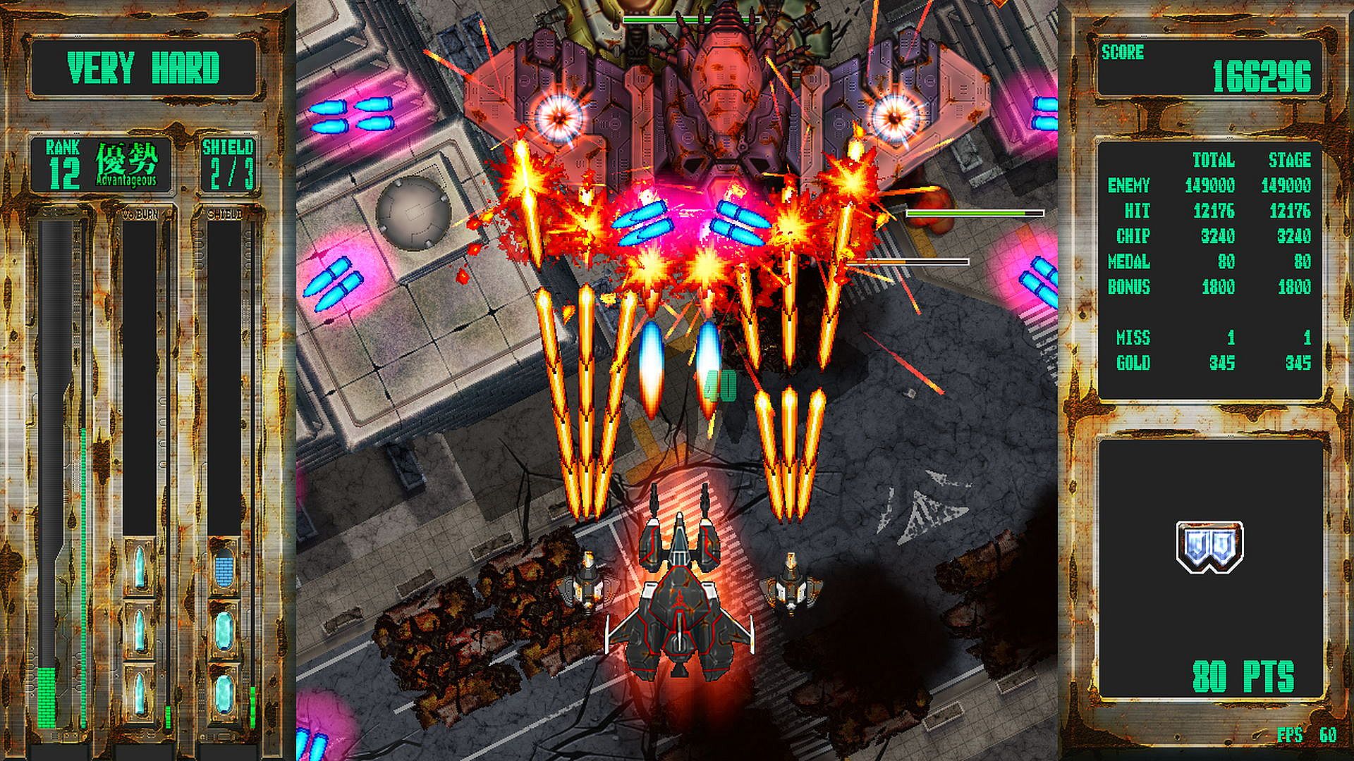 Vertical scrolling shmup where defeating enemies at close range is key.