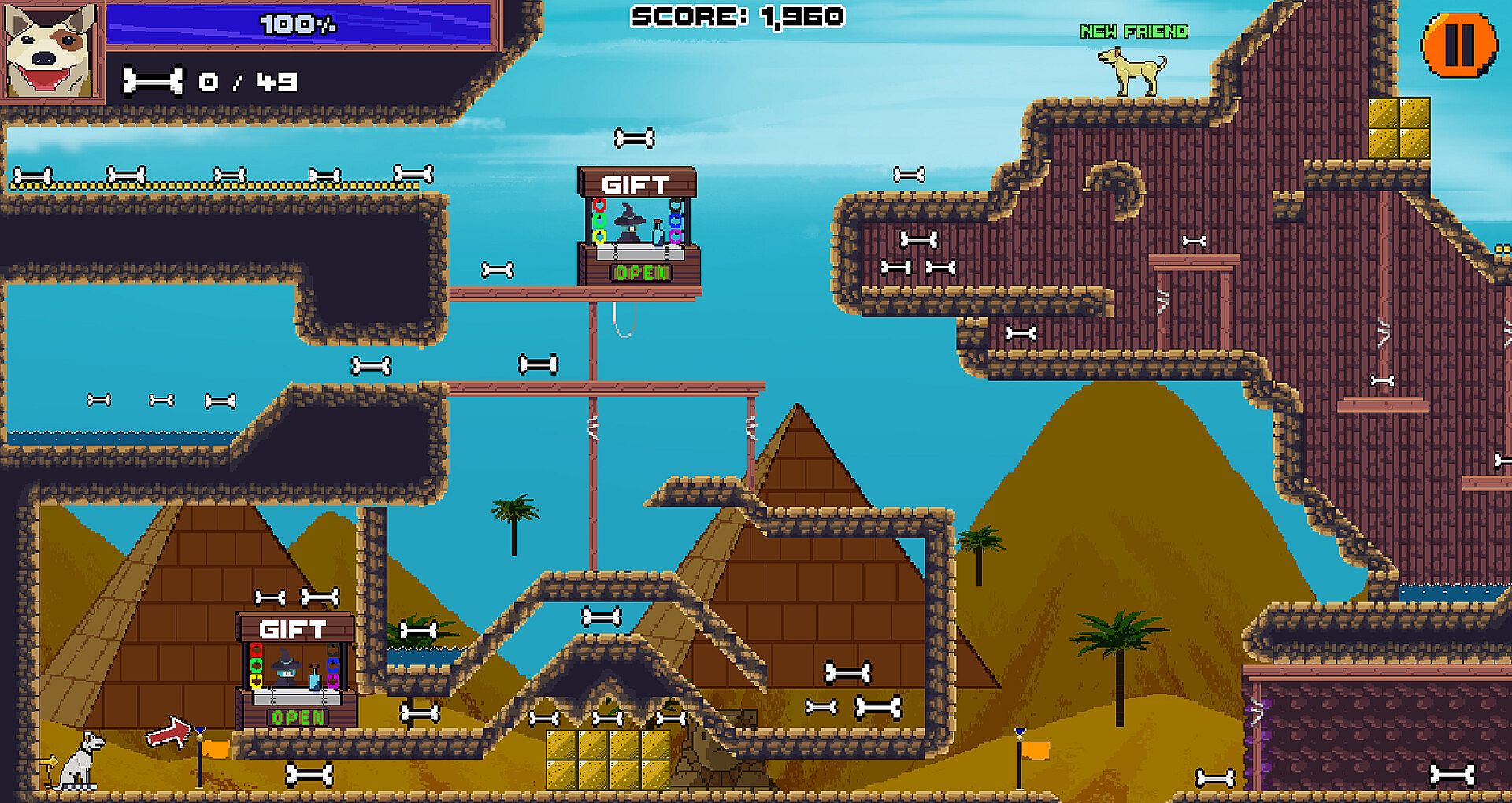 Compete with Speed: Each level has a starting amount of points, which ticks down over time. Collecting bones awards more points, and completing the level quickly will keep your score intact. Balance speed with exploration to maximize your run score.