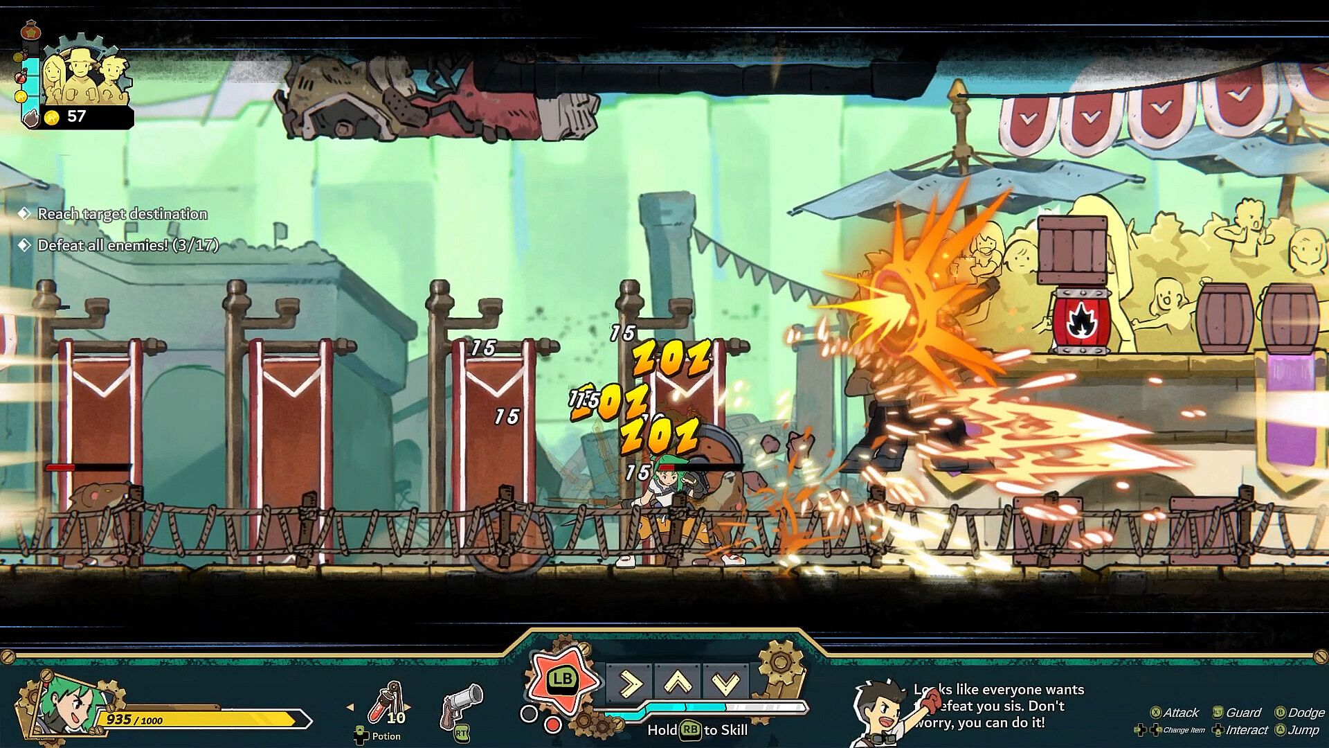 Look at your surroundings! Traps, barrel, items, and spectator. You can use your surroundings to your advantage to create an exciting combat experience.