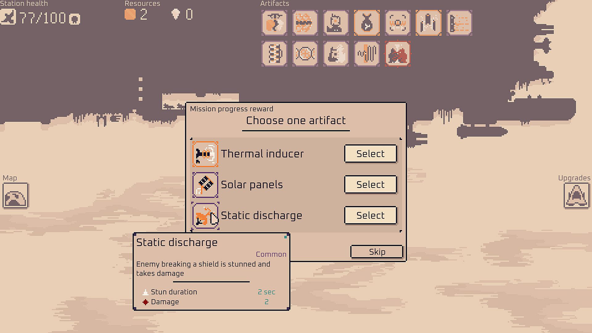 • Choose next mission: scout for new opportunities, mine more resources, discover rare artefacts, defend the position or prepare to fight the boss!