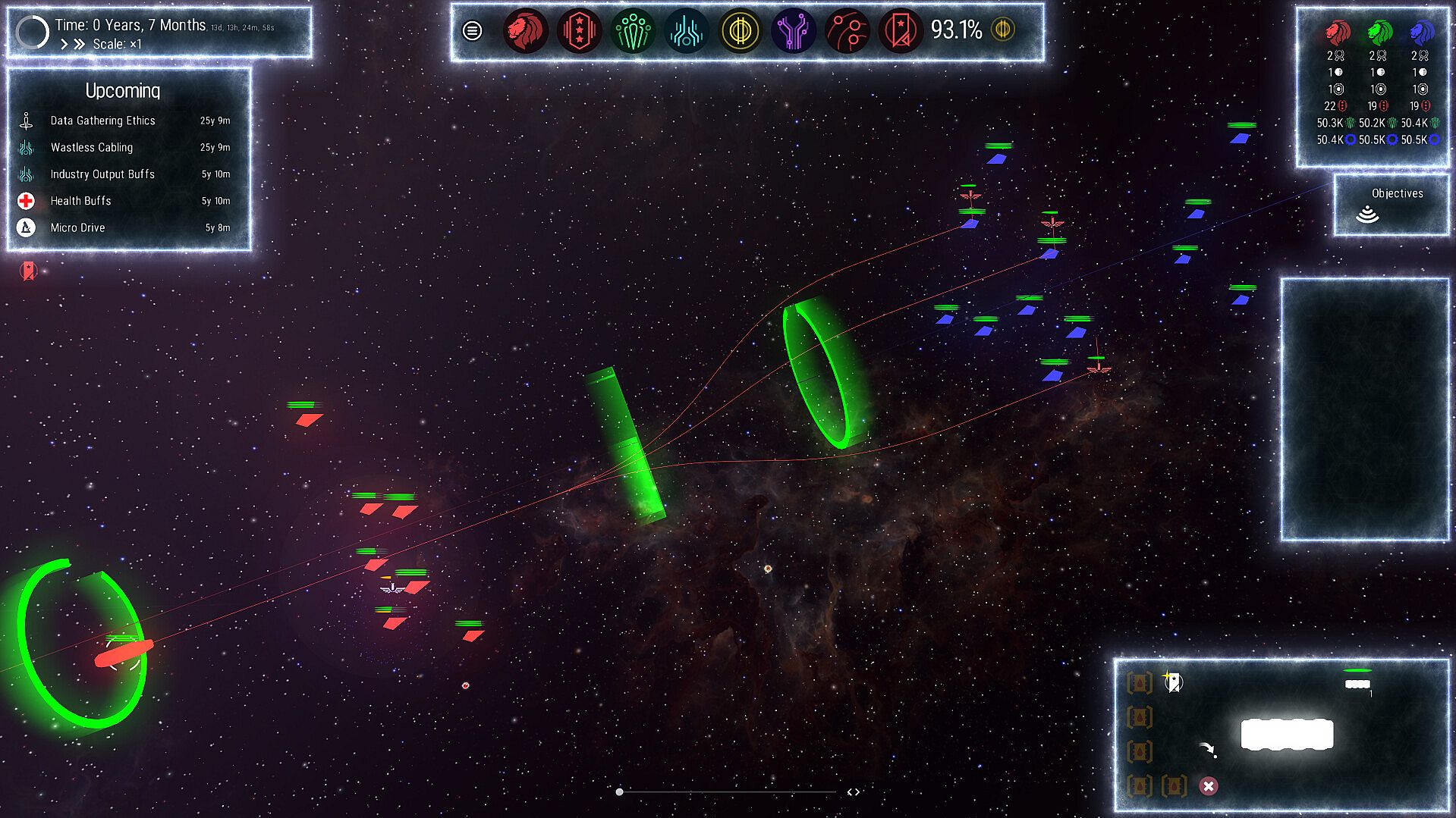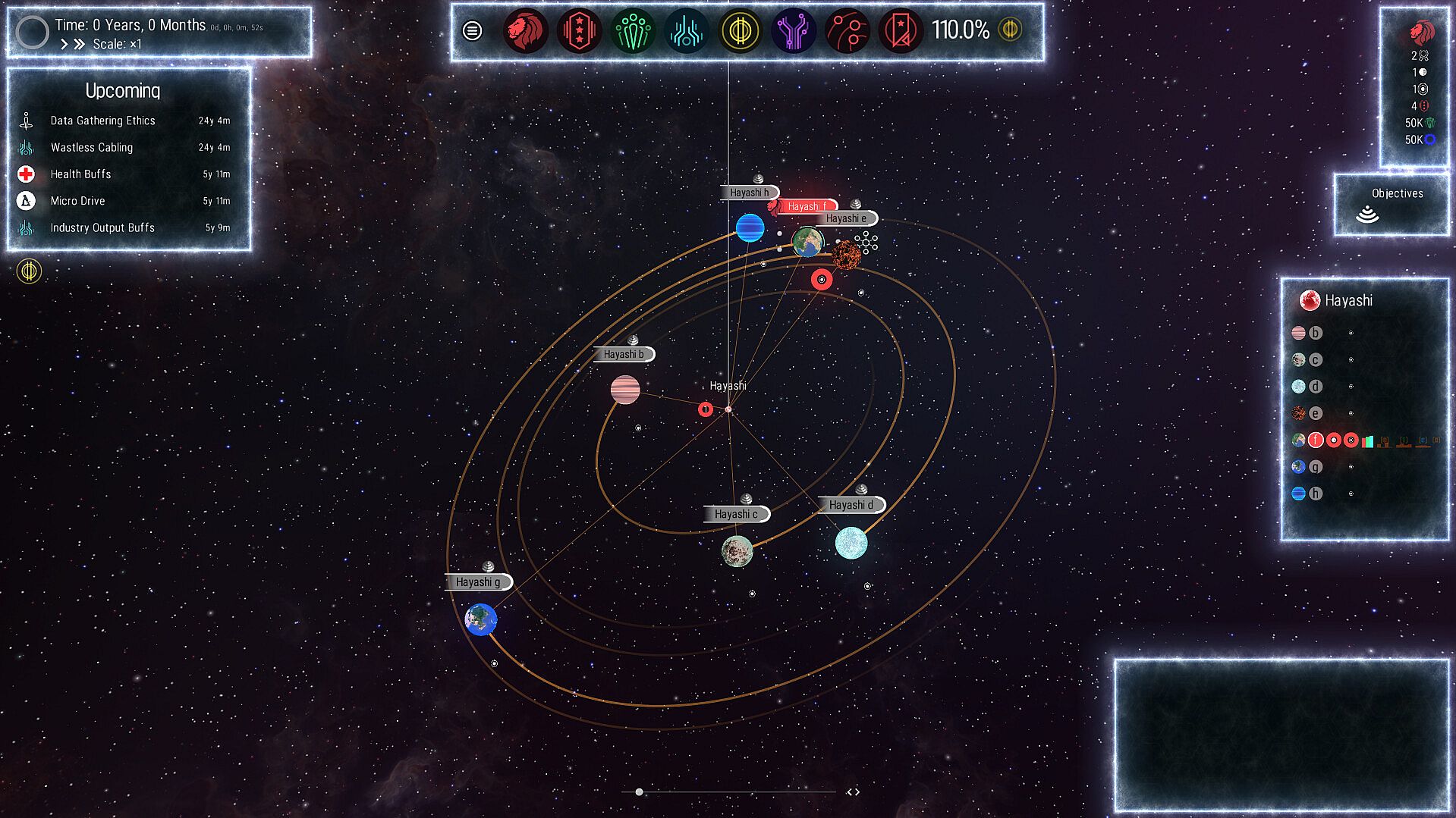 Your faction will advance simultaneously through six distinct tech trees, each helping you move closer to interstellar dominance. From military innovations to industrial breakthroughs, each tree offers tools for success in different areas of empire-building. As you progress, you’ll need to strategically prioritize and balance your research to create synergies between the trees. Mastering the tech trees isn't just about unlocking new technologies, it's about finding the most effective routes to victory, whether through military conquest, economic prosperity, or industrial supremacy.