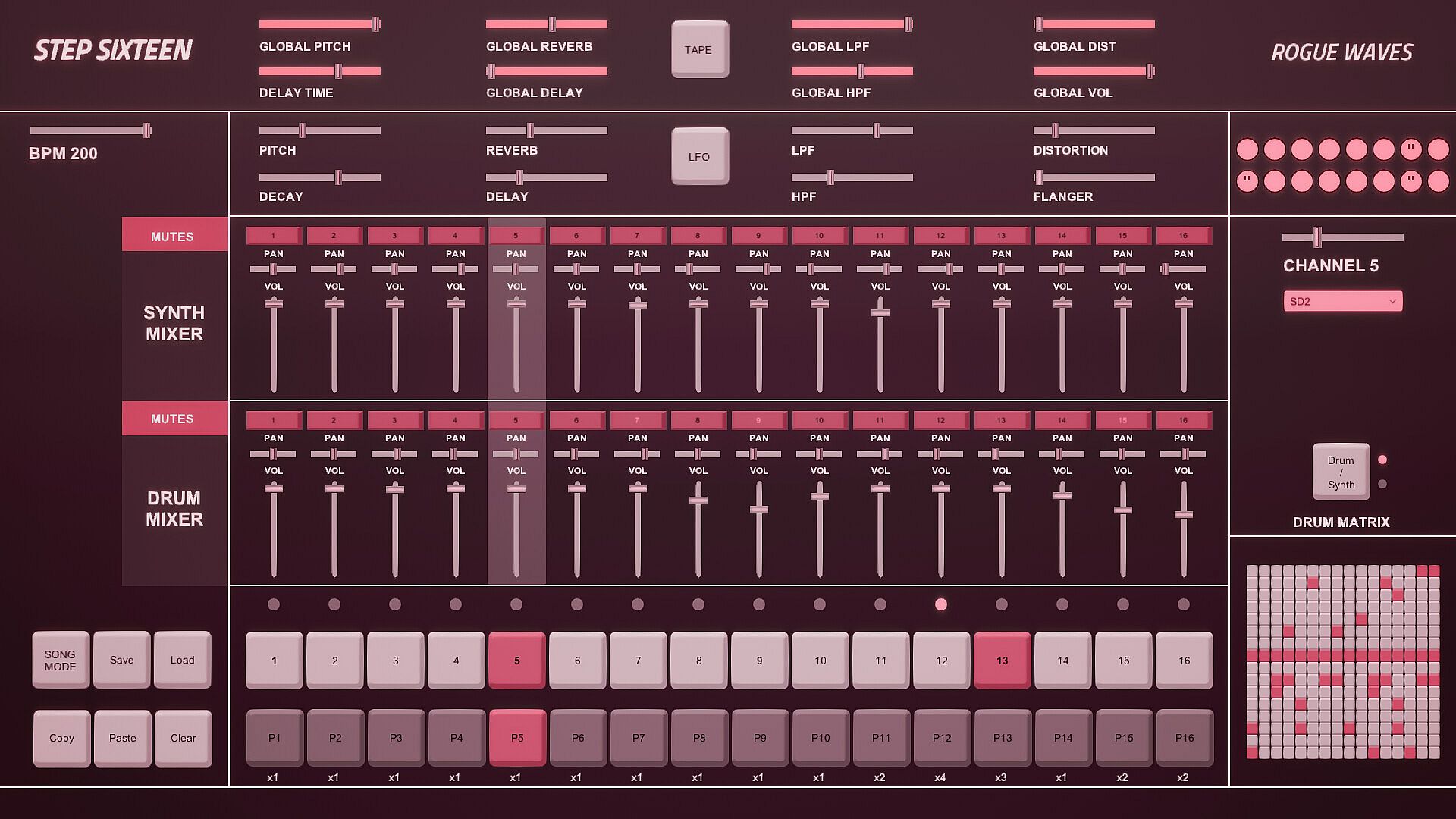 If the current matrix is set to Drum Matrix the user can input steps across all drum channels without having to change channels.