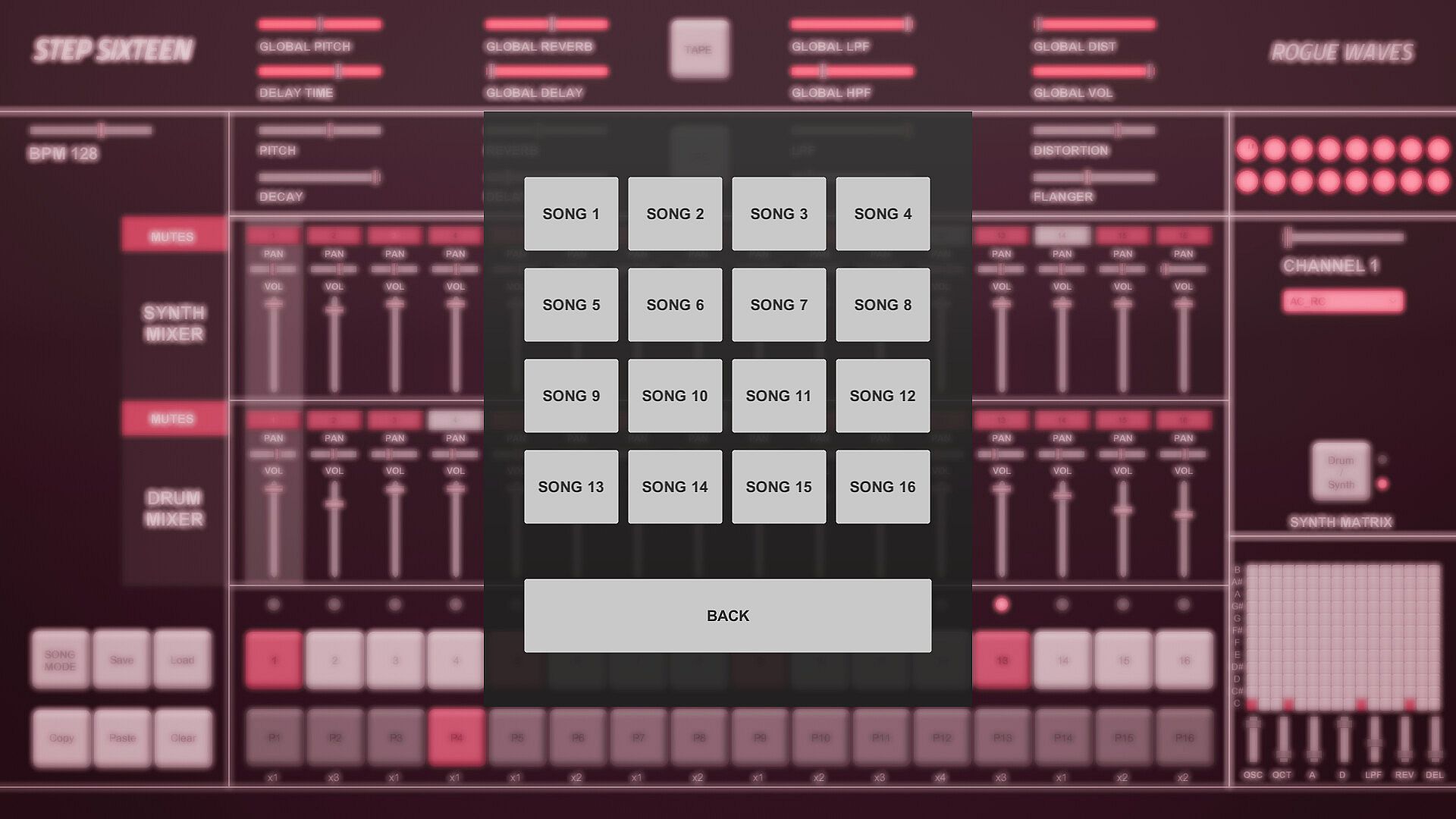 If the current matrix is set to Synth Matrix the user can input steps on the currently selected synth channels.