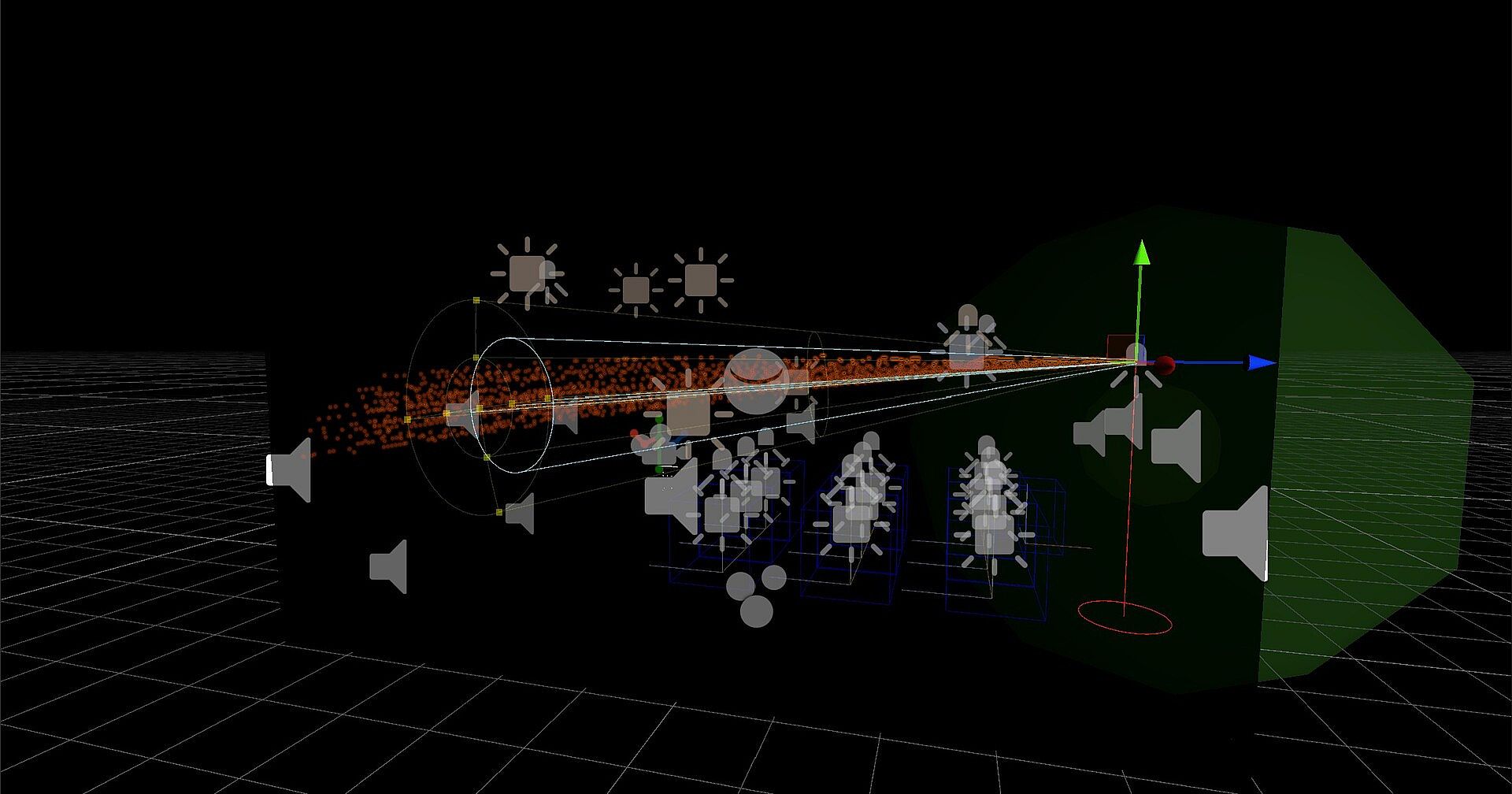 • Optional projector beam with visible particle rays and cinematic god-rays