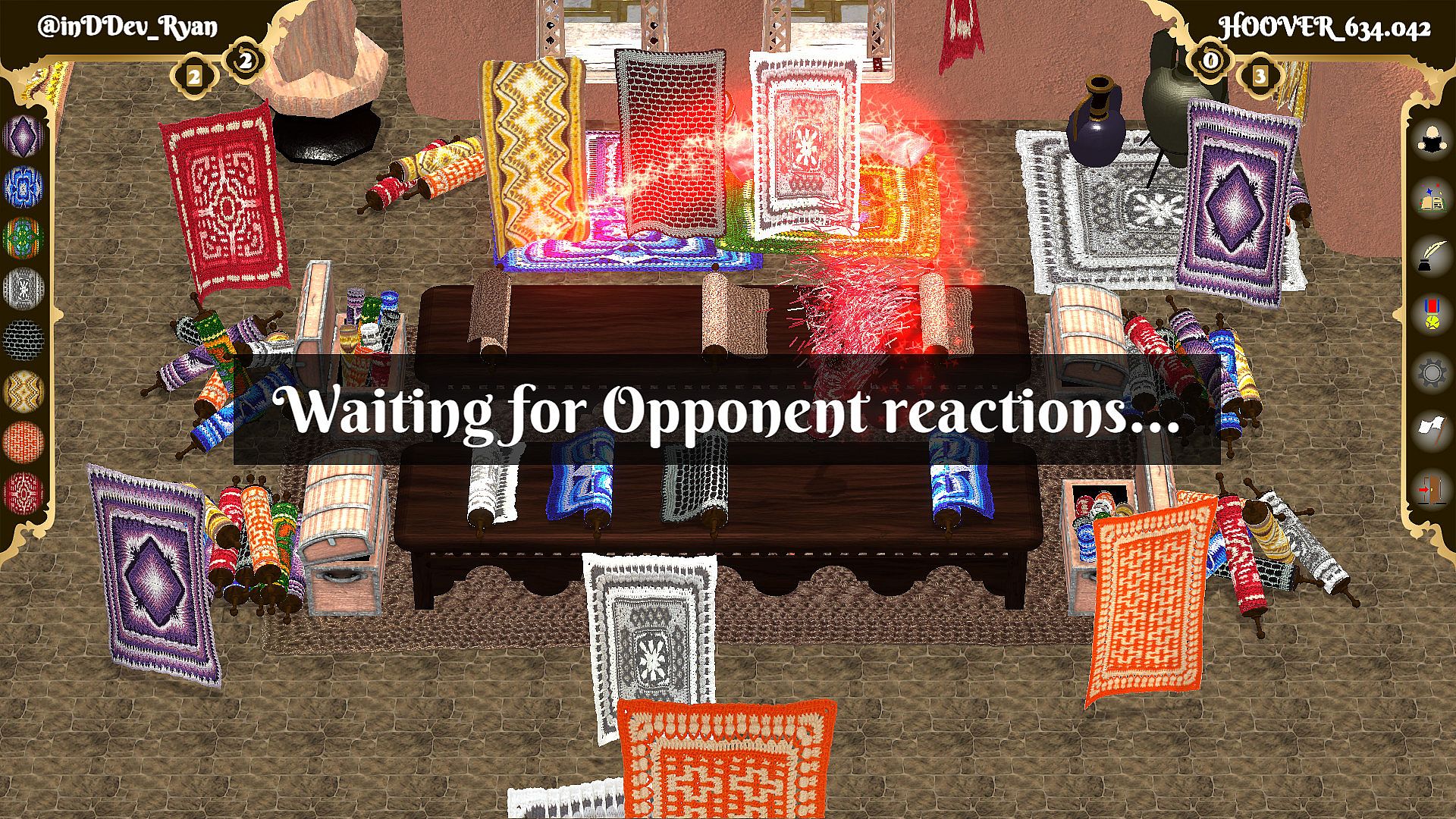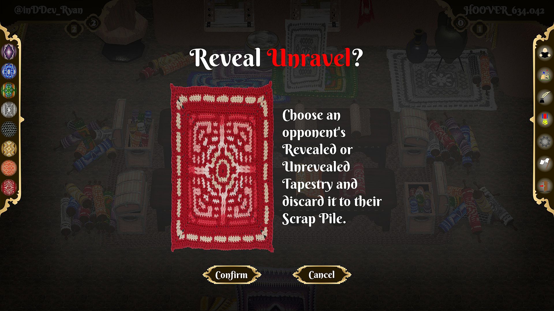 Click a Tapestry in your hand to Play it into your Display on the table in front of you. A Tapestry in the Display is Unrevealed. The opponent can't see the color, and its power is ready to use on another action, but it is not yet part of the Showcase victory condition.
