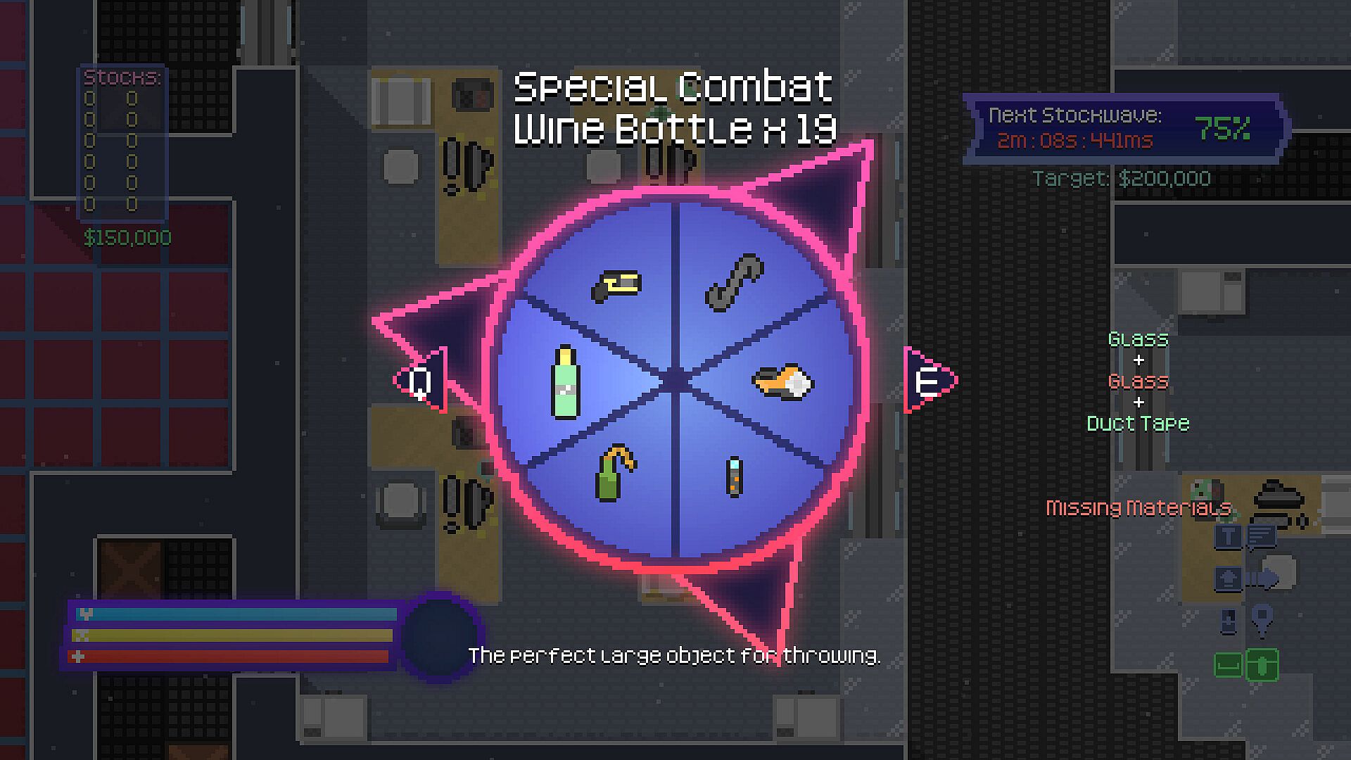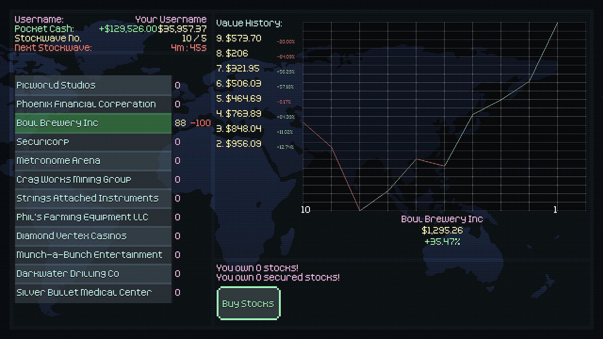 Everyone gets access to the stock traders' web, where you can buy and sell your acquired assets. Wait for a Stockwave event to appear, and all stock value progresses. This is the core of money making, along with protecting these purchased assets from prying hands looking to leverage them from you. The best stock-trader by the end can claim their title of: "Employee of the Month", and a hefty bonus.