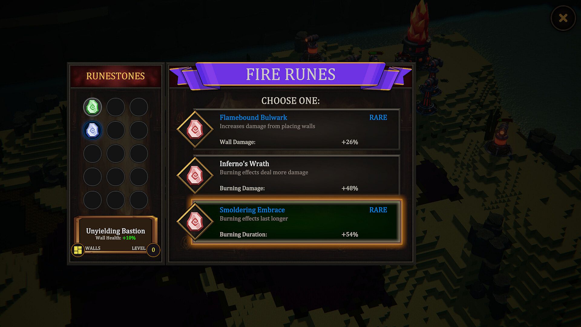 Discover elemental runes that enhance your towers and spells. Runes come in different rarities, applying effects like Burn, Slow, Poison, and Mark. Or boosting stats like damage, range, and health. Mix and match to unlock powerful synergies and shape your strategy each run.