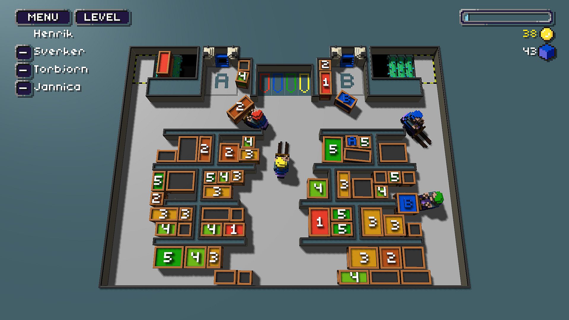 Each player controls a forklift truck in a warehouse.
