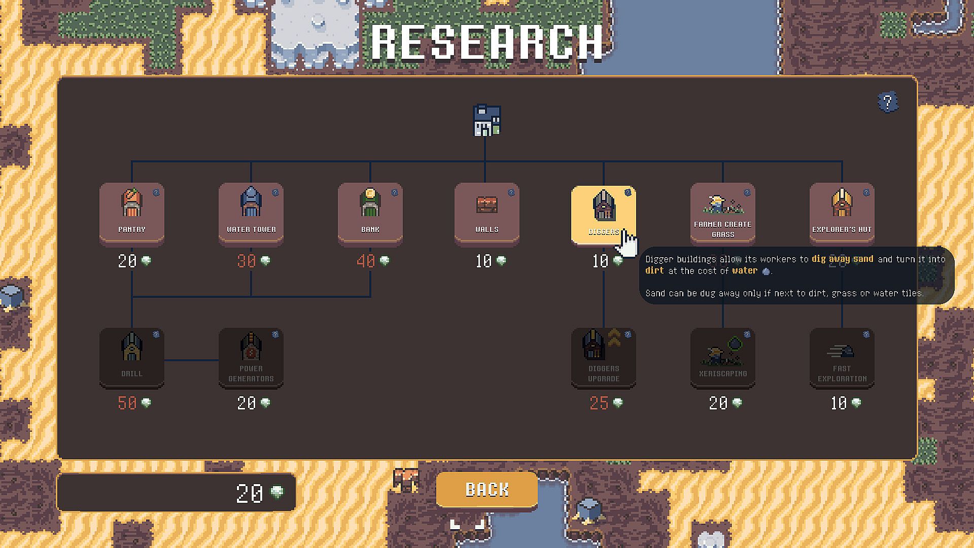 Modify the terrain by breaking rocks, growing new patches of grass and digging away sand to expand your buildable area.
